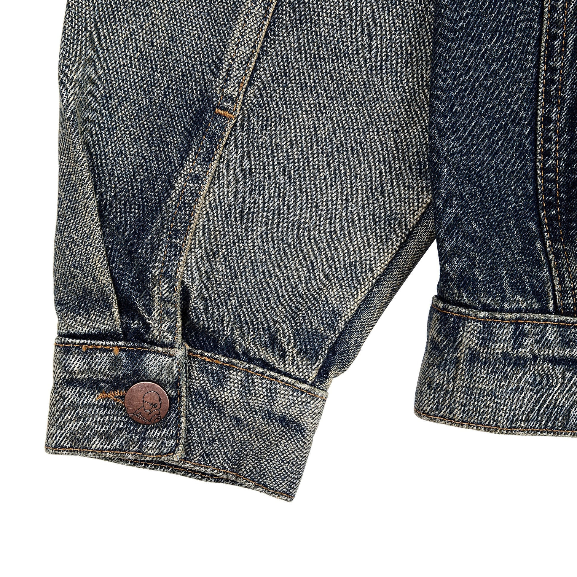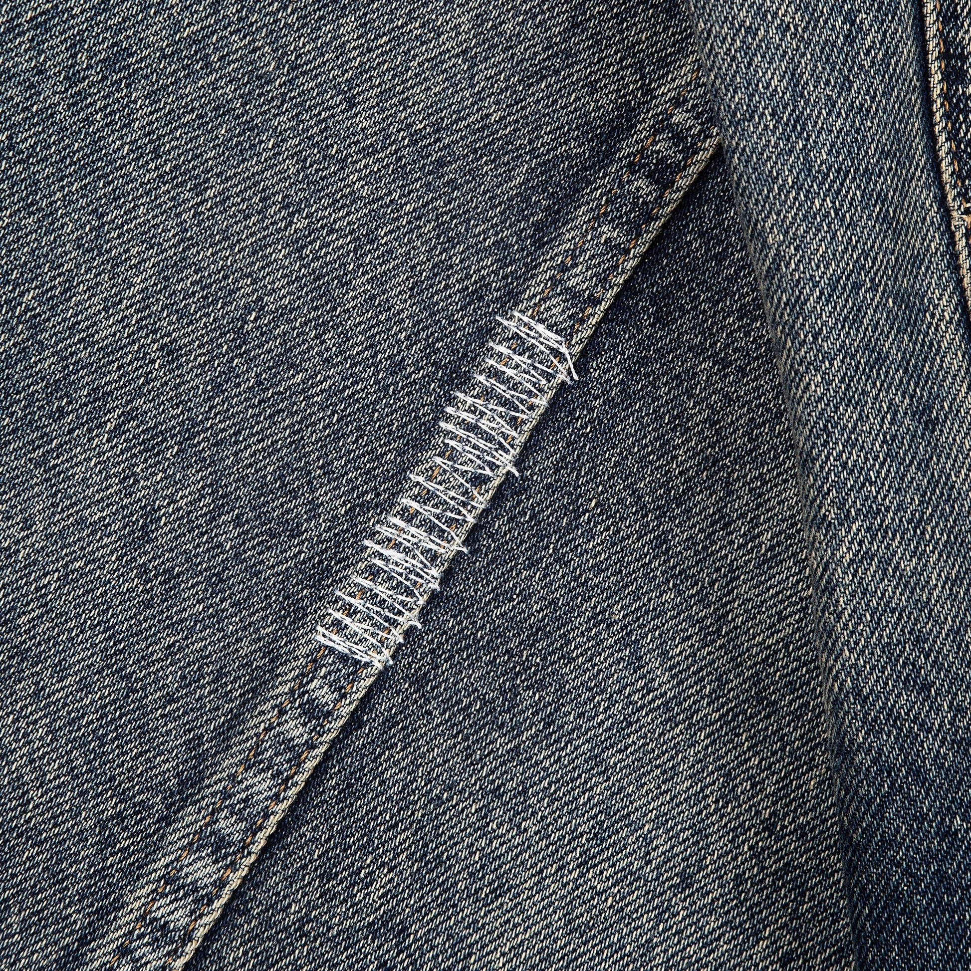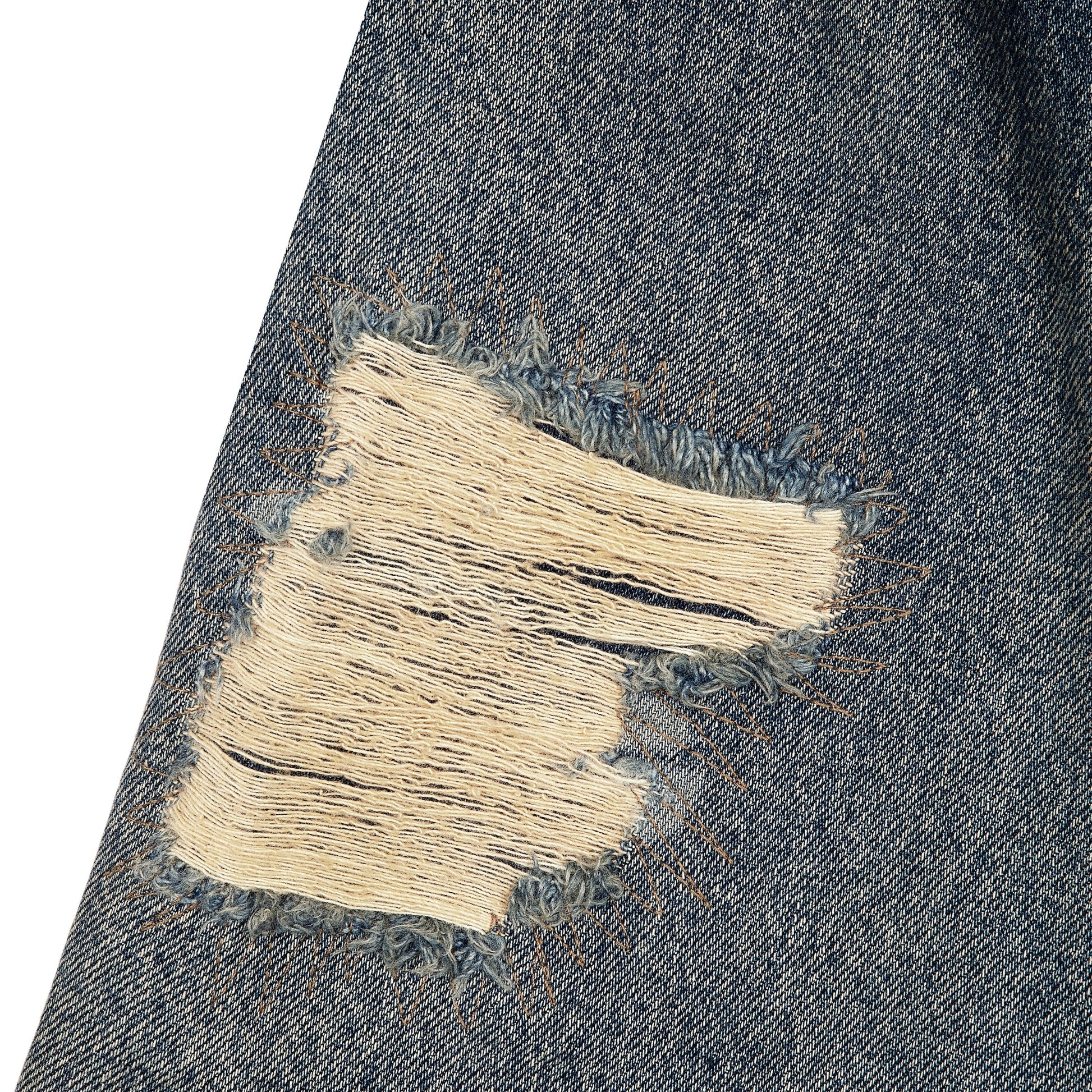 14,5oz denim / 100% cotton /?woven design on back / distressed all over with backing patches underneath (not see-through) / true to size