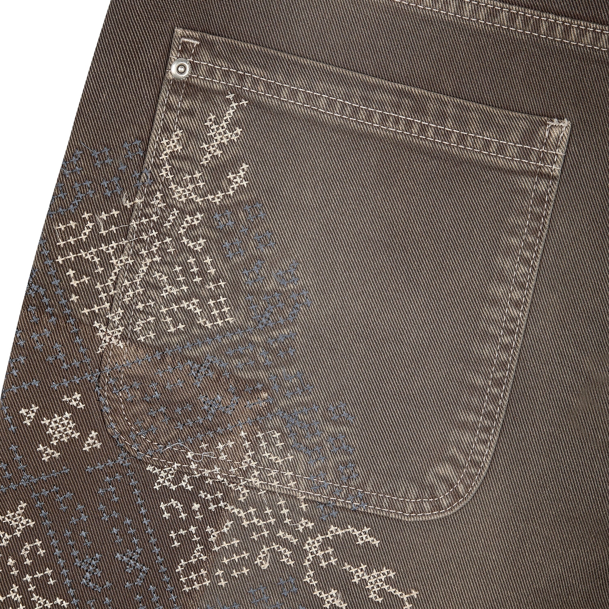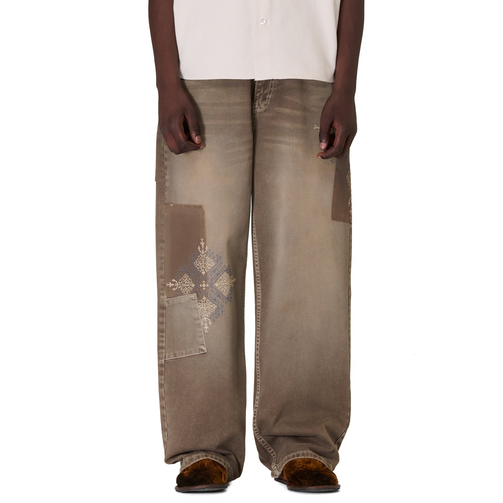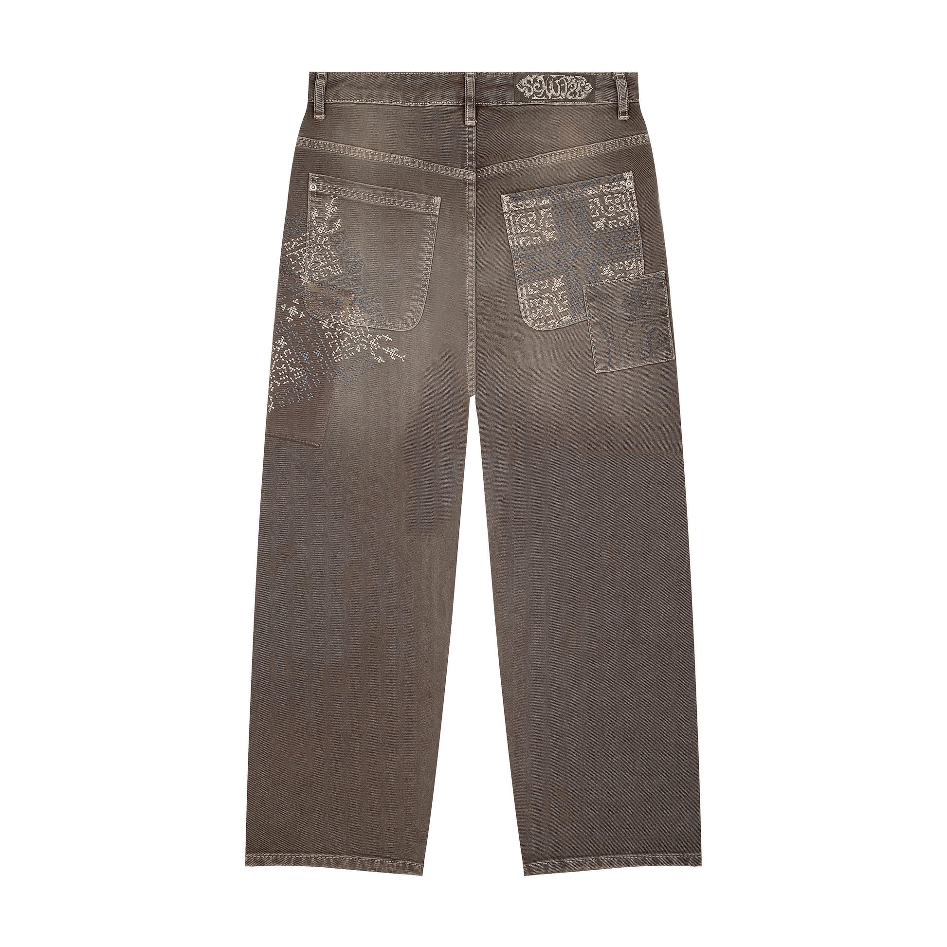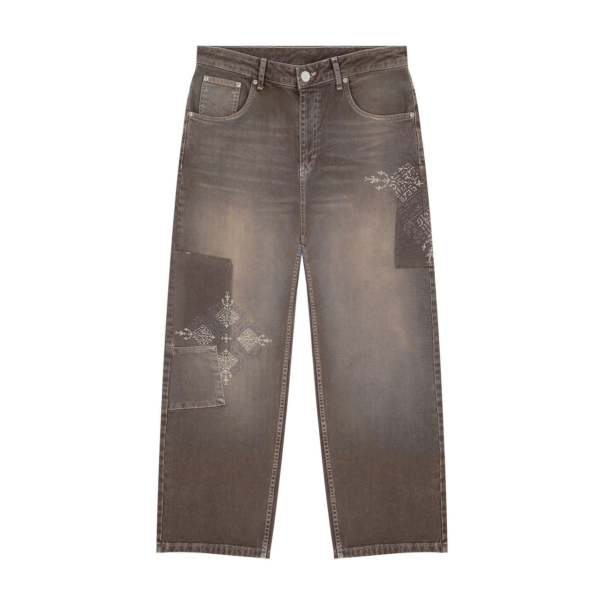 14,5oz denim / 100% cotton / embroidery on front and back / patches on front and back / embroidered?leather patch / custom button / brown washed effect / wash inside out / fits true to?size