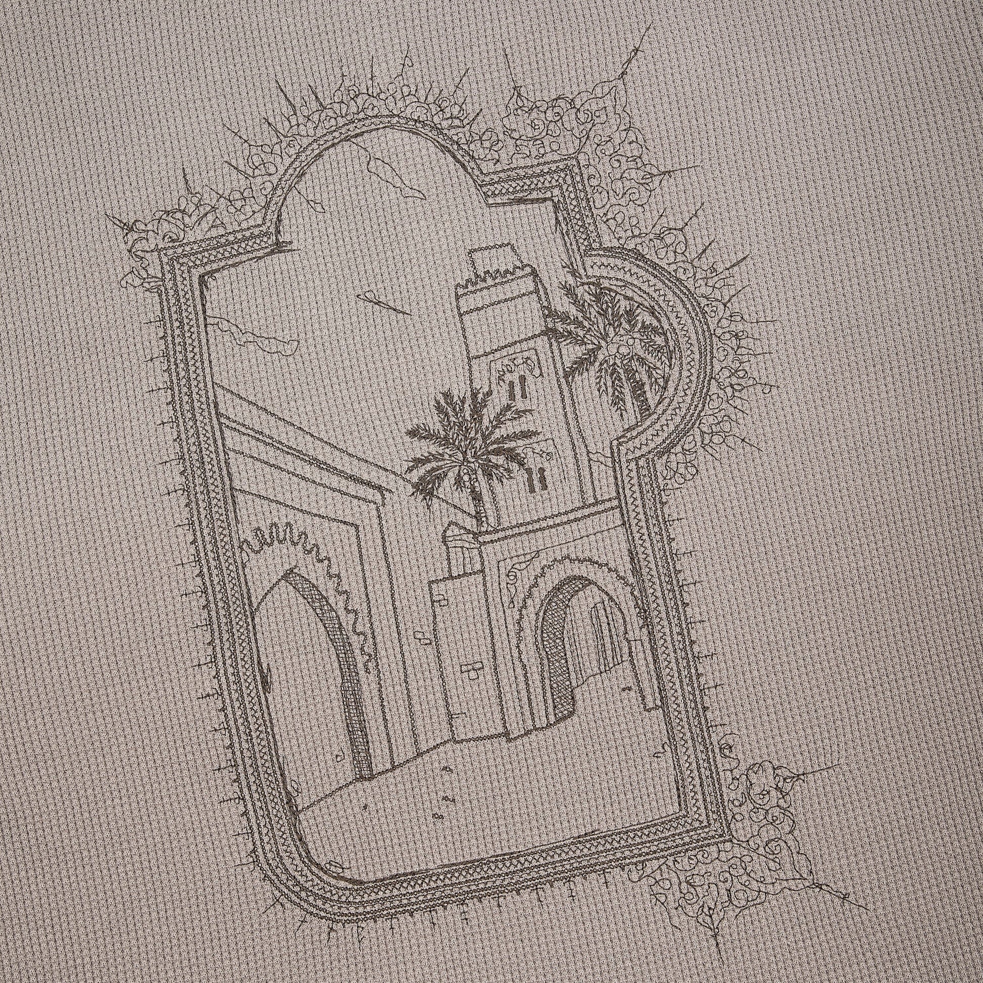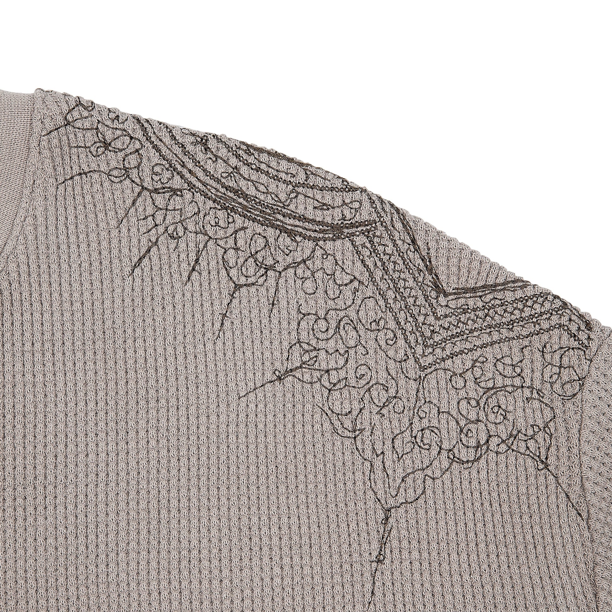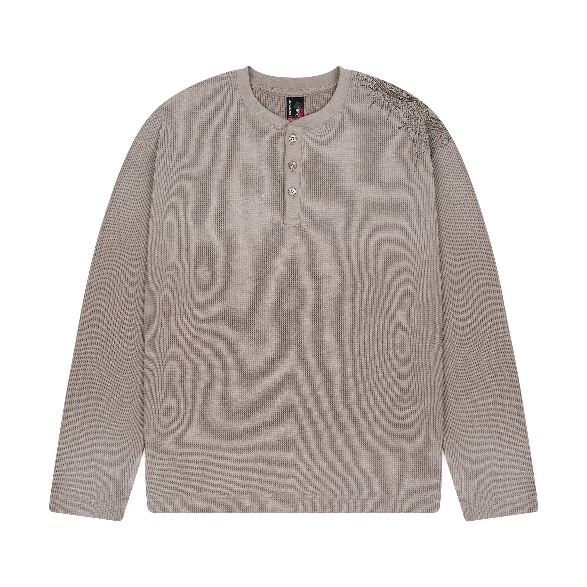 320gsm preshrunk waffle fabric / 97% cotton 3% elastane / embroidery on front and back / bleaching washing effect on shoulder, hem and sleeves / fits true to size