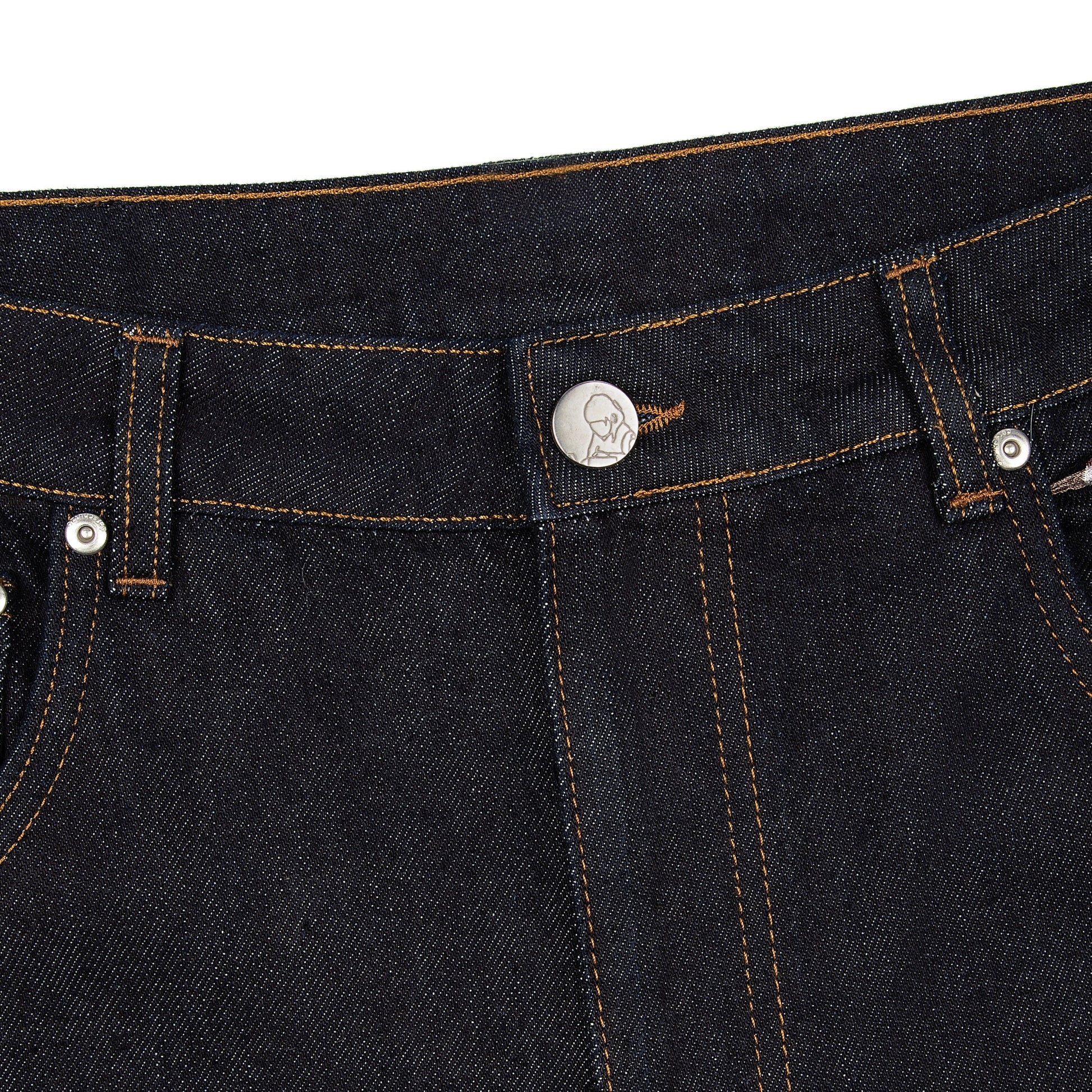 13oz selvedge denim / 100% cotton / embroidery on front and back pocket / embroidered leather patch / balloon fit (different to our usual fit) / fabric may bleed or fade, wash inside out in cold water to preserve color and character / fits true to size