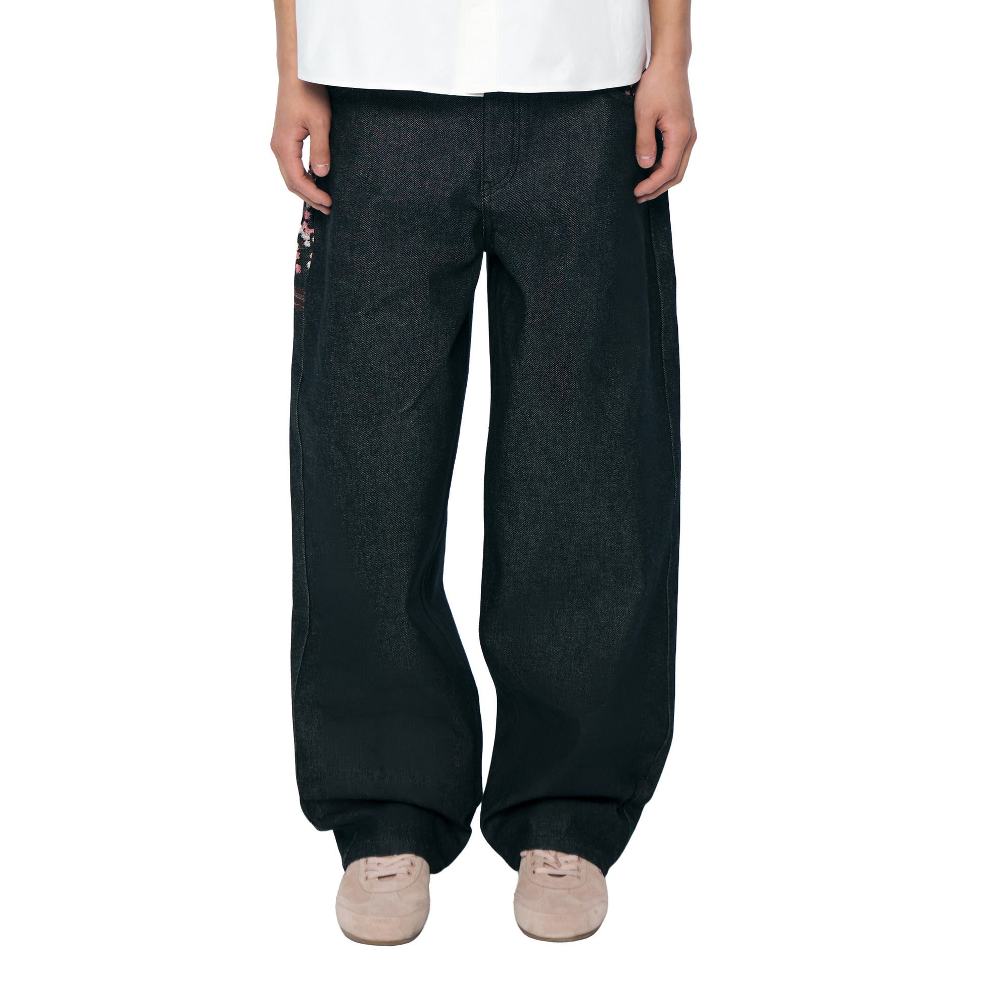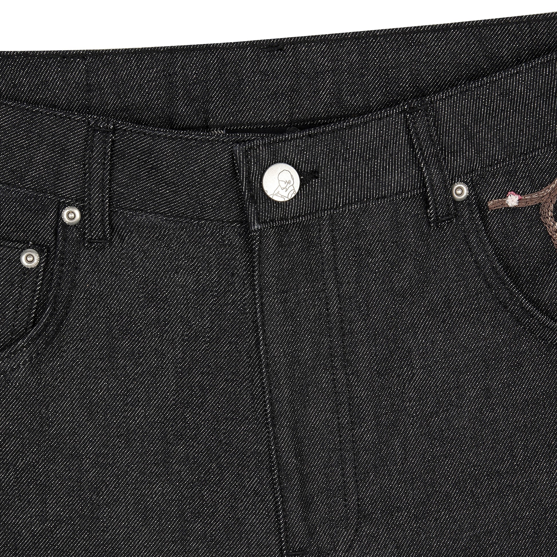 14oz raw denim / 100% cotton / embroidery on front and back pocket / embroidered?leather patch / balloon fit (different to our usual fit) / wash inside out / fits true to size