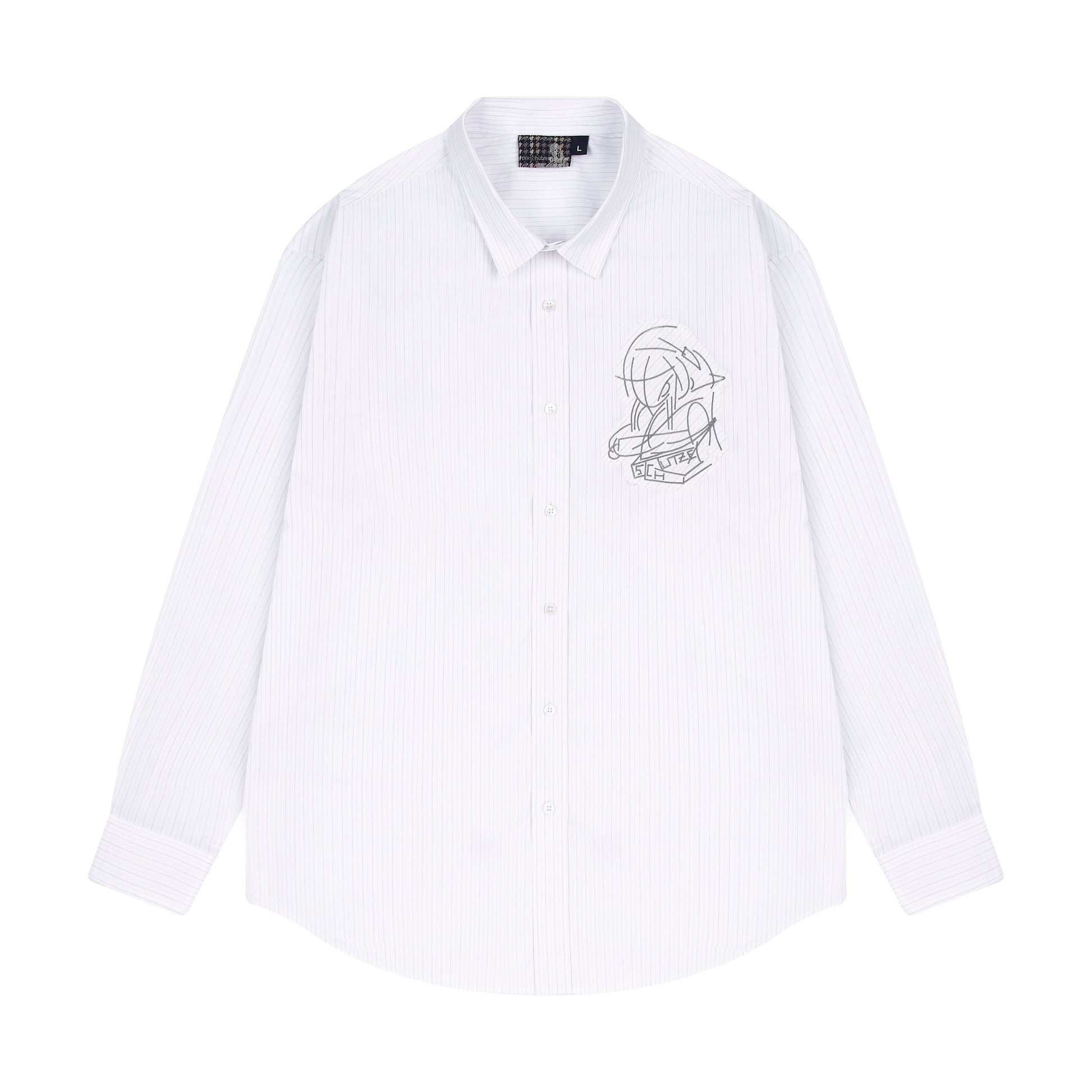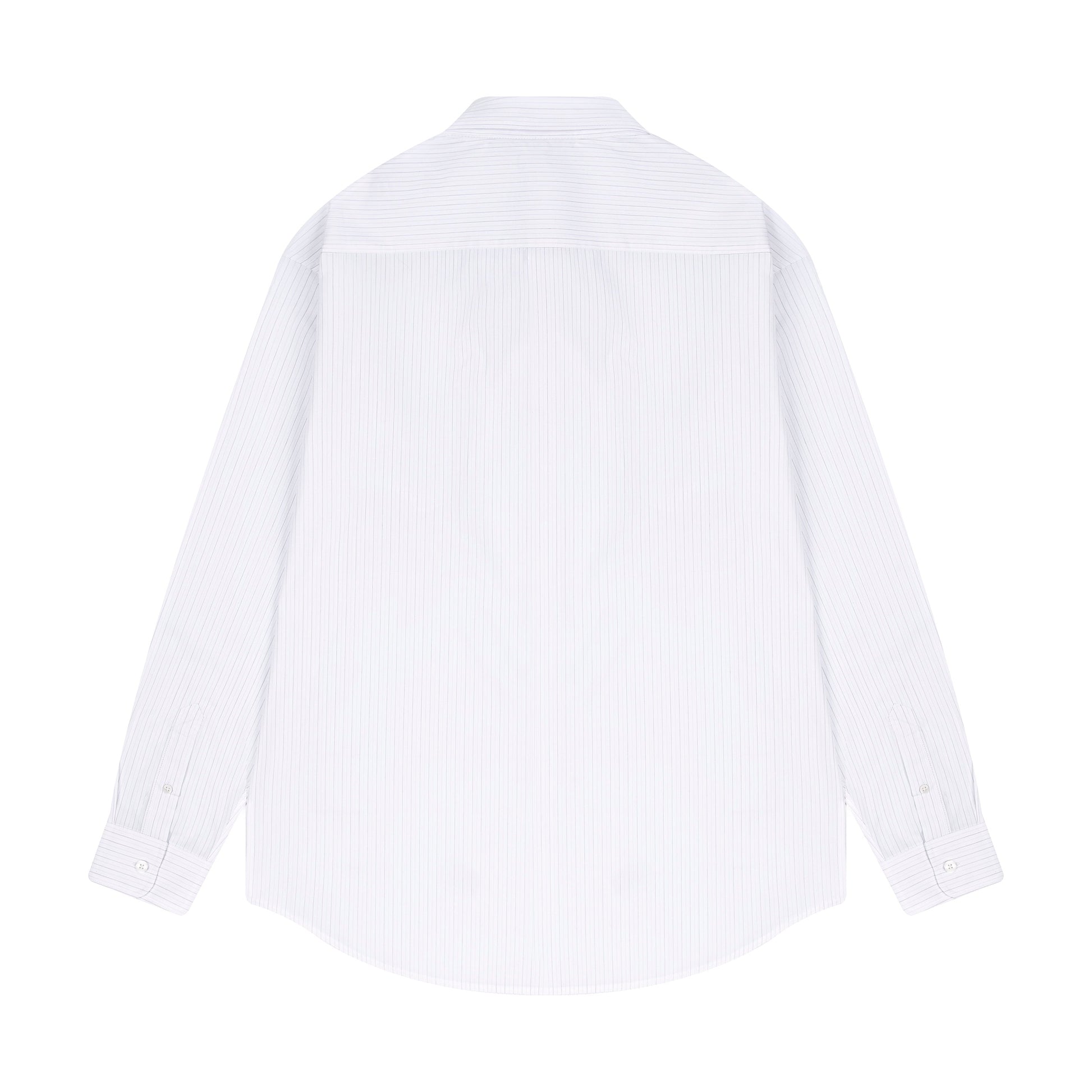 100% cotton / white-grey striped / embroidery on front / custom buttons / curved hem / relaxed fit / fits true to size