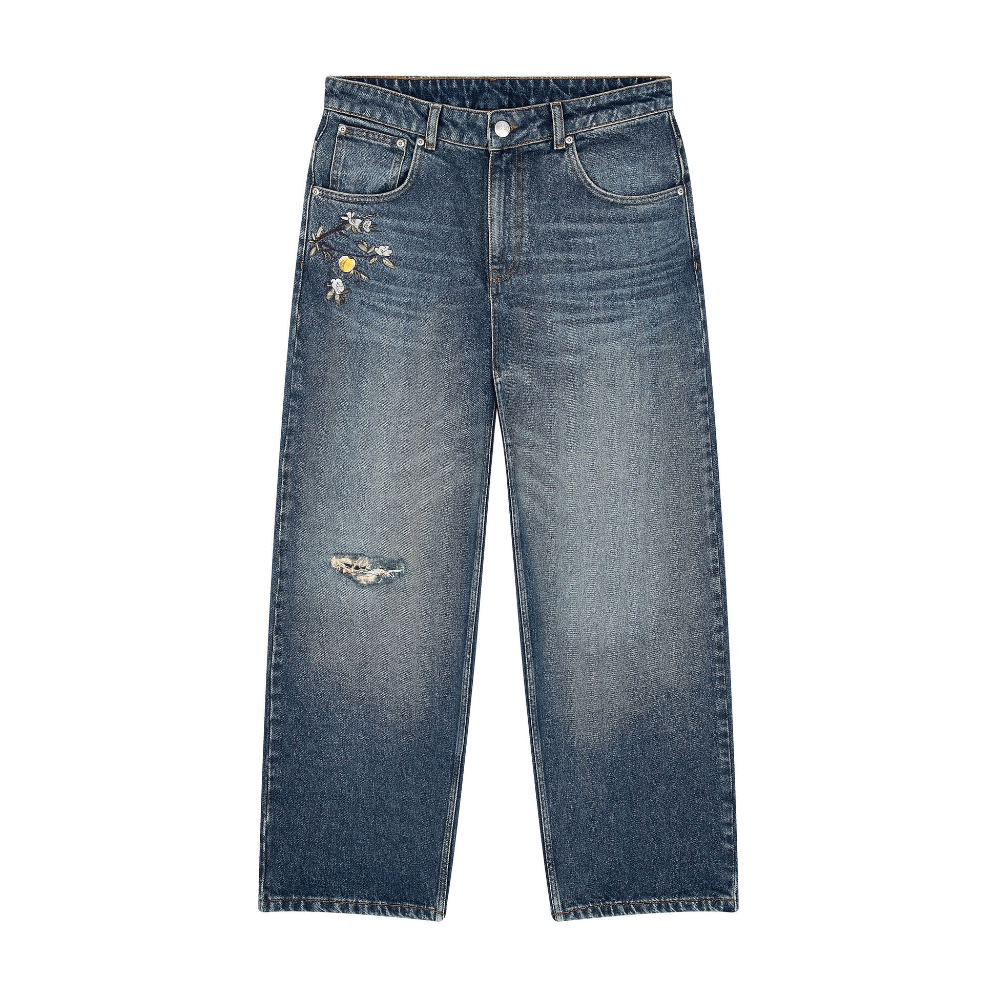 14,5oz denim / 100% cotton / embroidery on front and back / effect washing / distressing on front and back / custom button / baggy fit / fits true to size