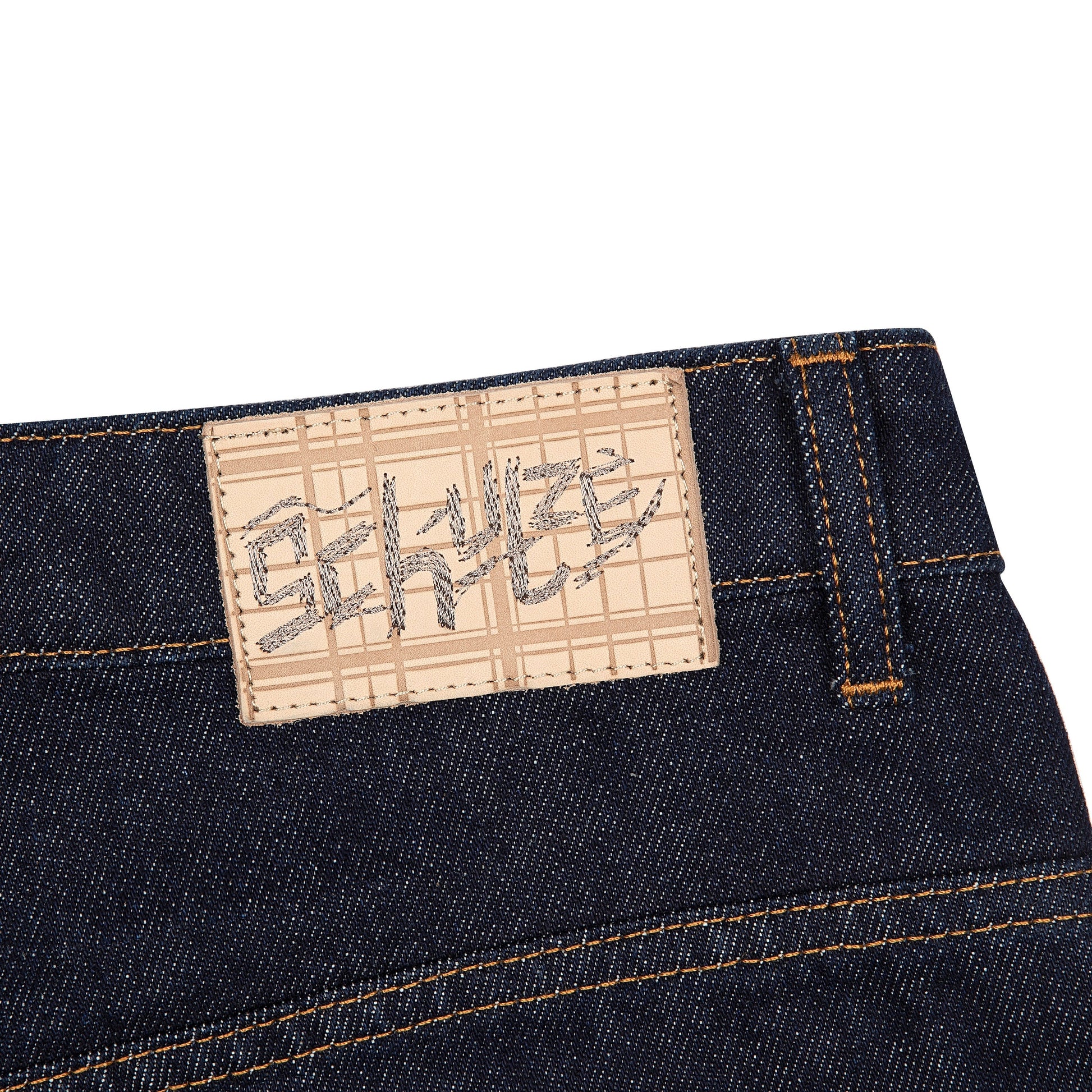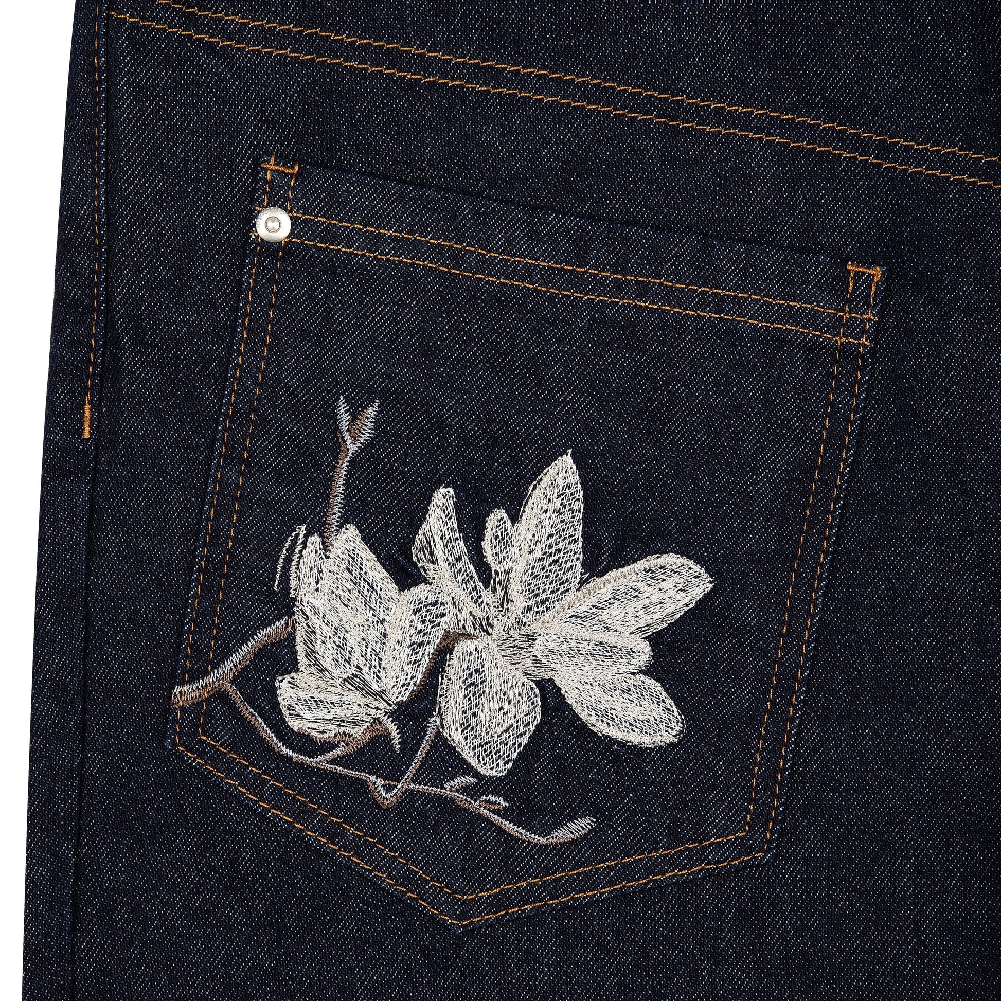 14,5oz raw denim / 100% cotton / yoke and back pocket look on front / embroideries on front pockets / plaid patterned deboss printed leather patch / custom button / baggy fit / fabric may bleed or fade, wash inside out in cold water to preserve color and character / fits true to size