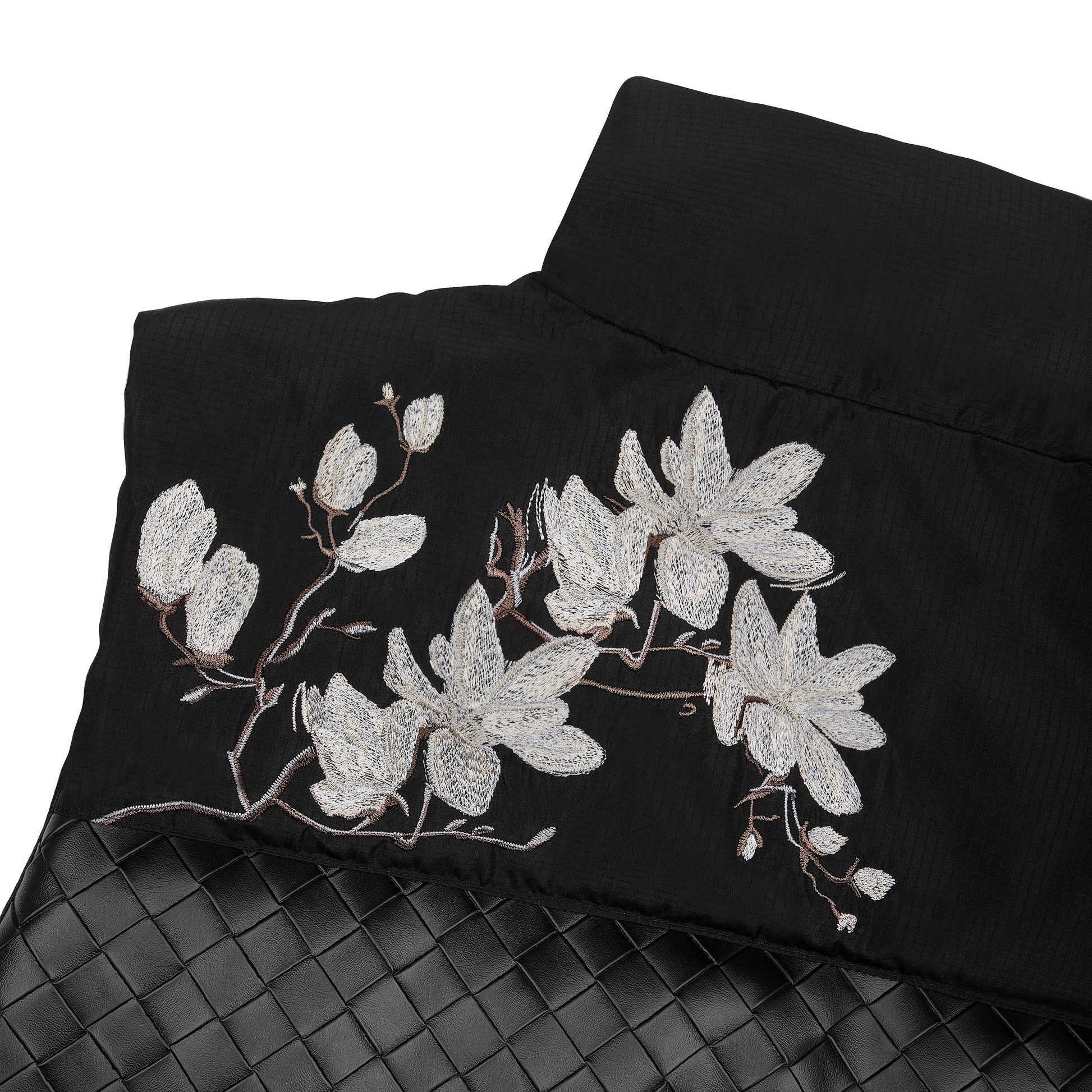 parachute fabric / 100% polyester / vegan woven leather / down feather filling / embroidery on front and back / with YKK zipper / fits true to size
