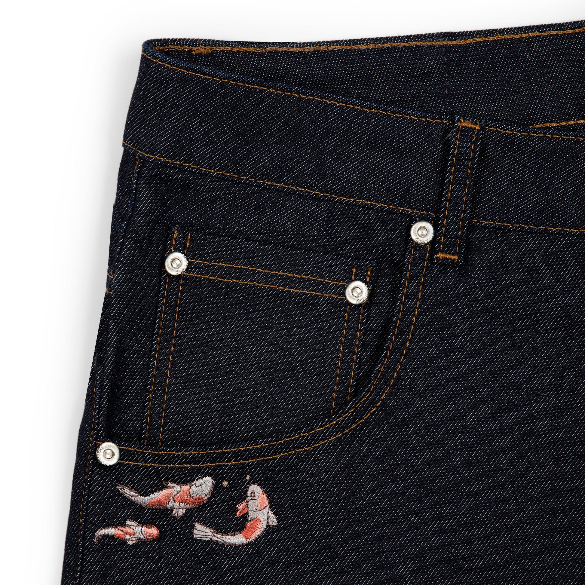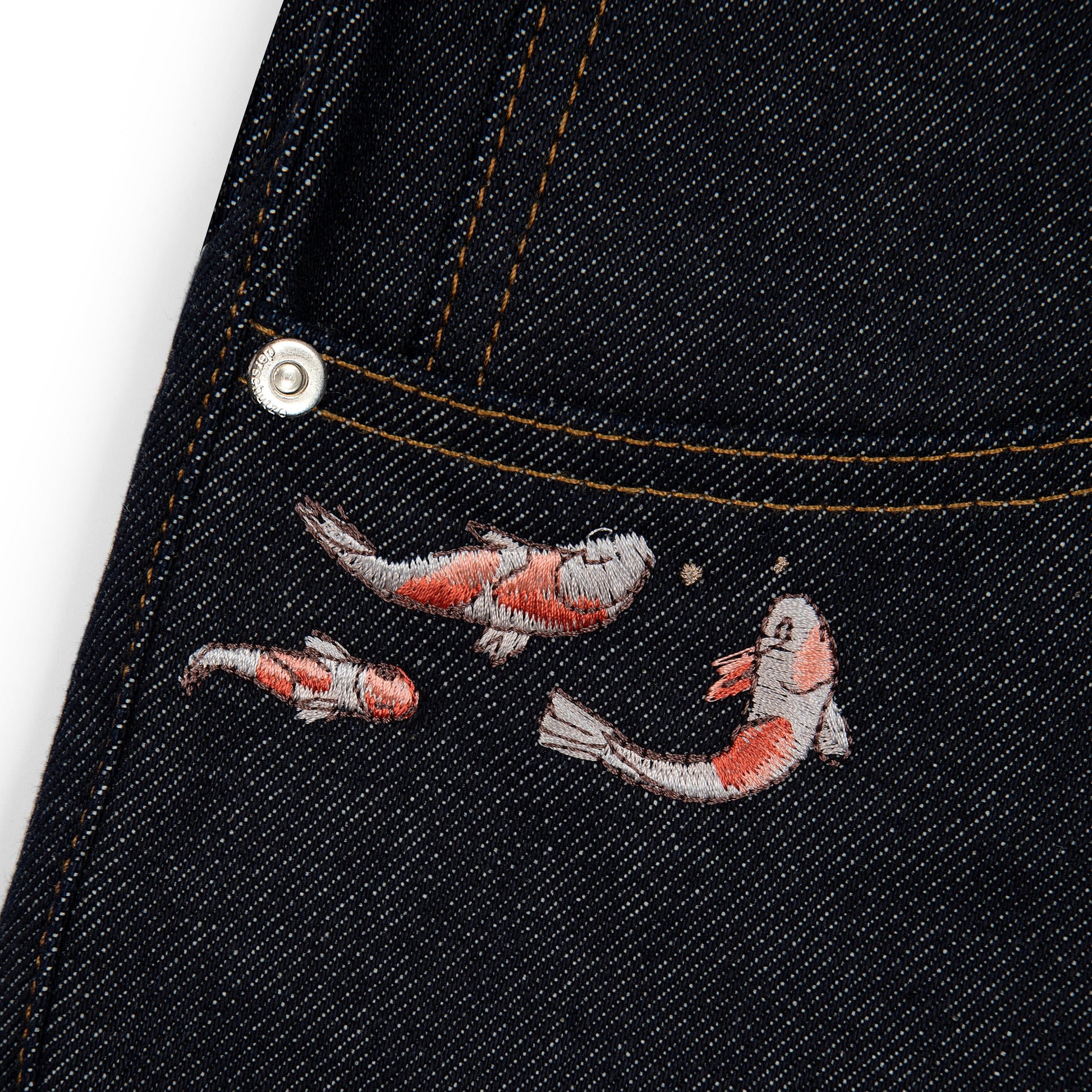 14,5oz denim / selvedge denim feel / 100% cotton / embroidery on front and back pocket / embroidered leather patch / baggy fit