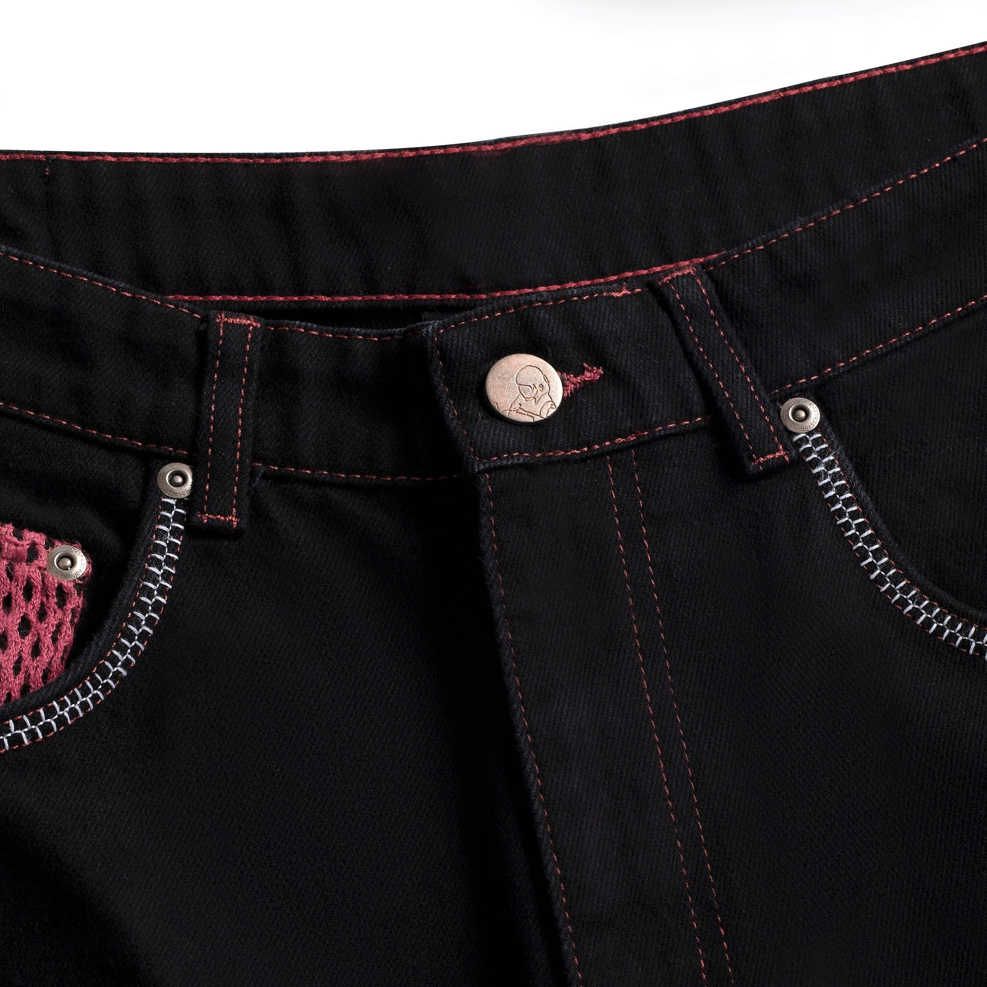 14.5oz denim / 100% cotton / embroidery on back pockets / embroidered leather patch / fish net detailing / baggy fit