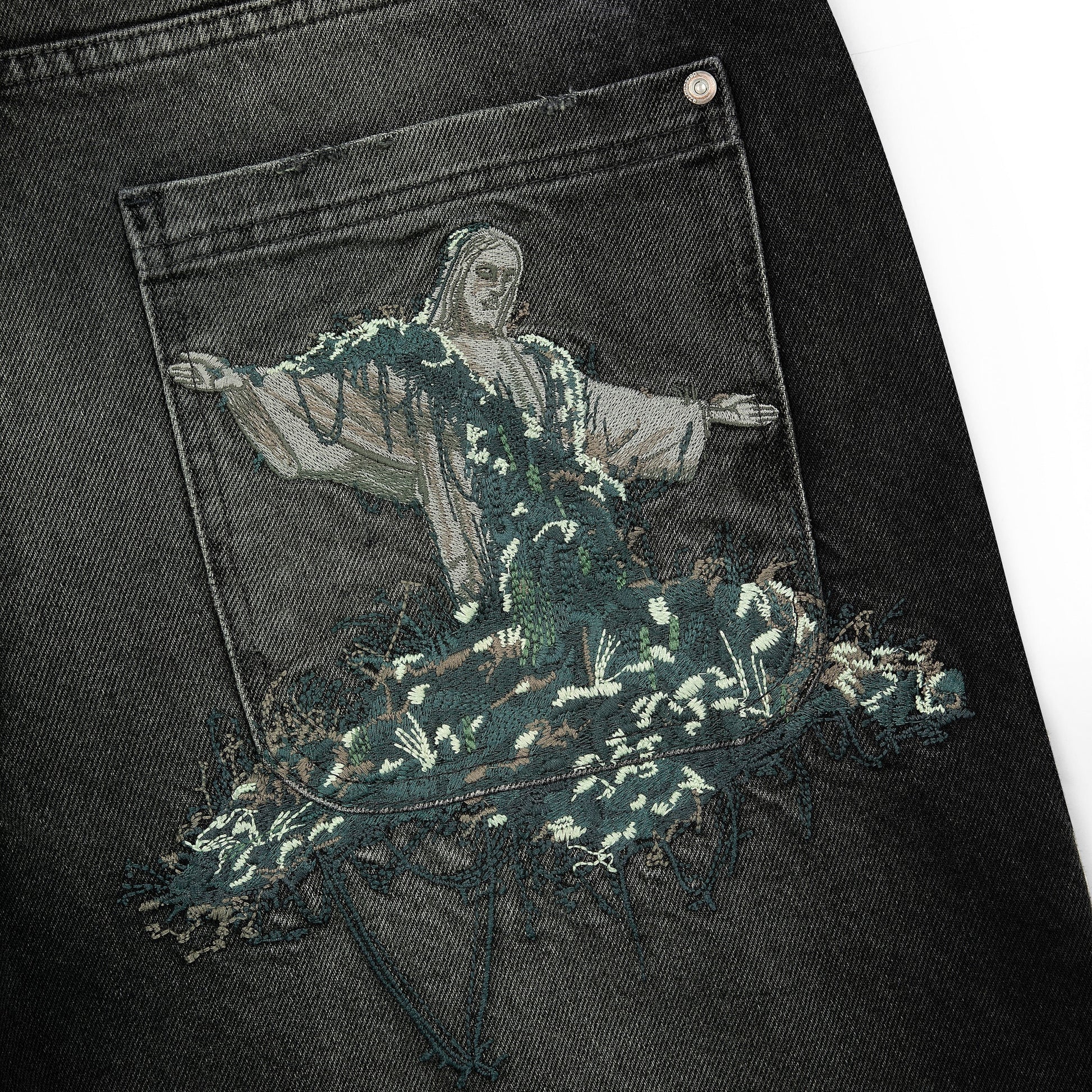 14,5oz denim / 100% cotton / patch embroidery on back pocket /?embroidered leather patch / gradient wash / baggy fit / fits true to size
