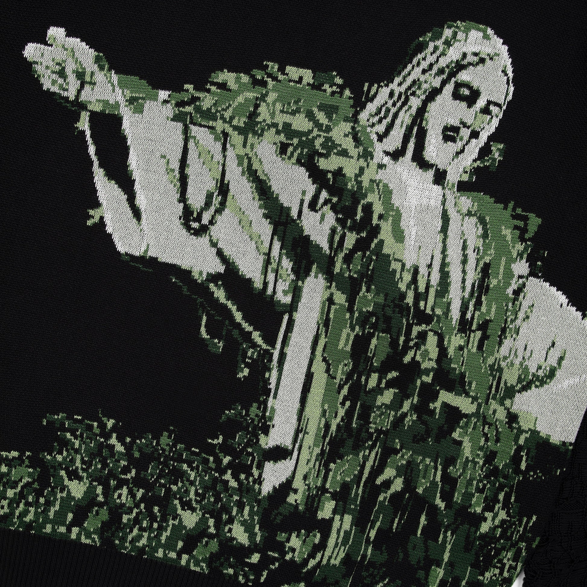100% cotton yarn / knitted pattern on the back / distressed knit pieces on shoulder and sleeves / fits true to size