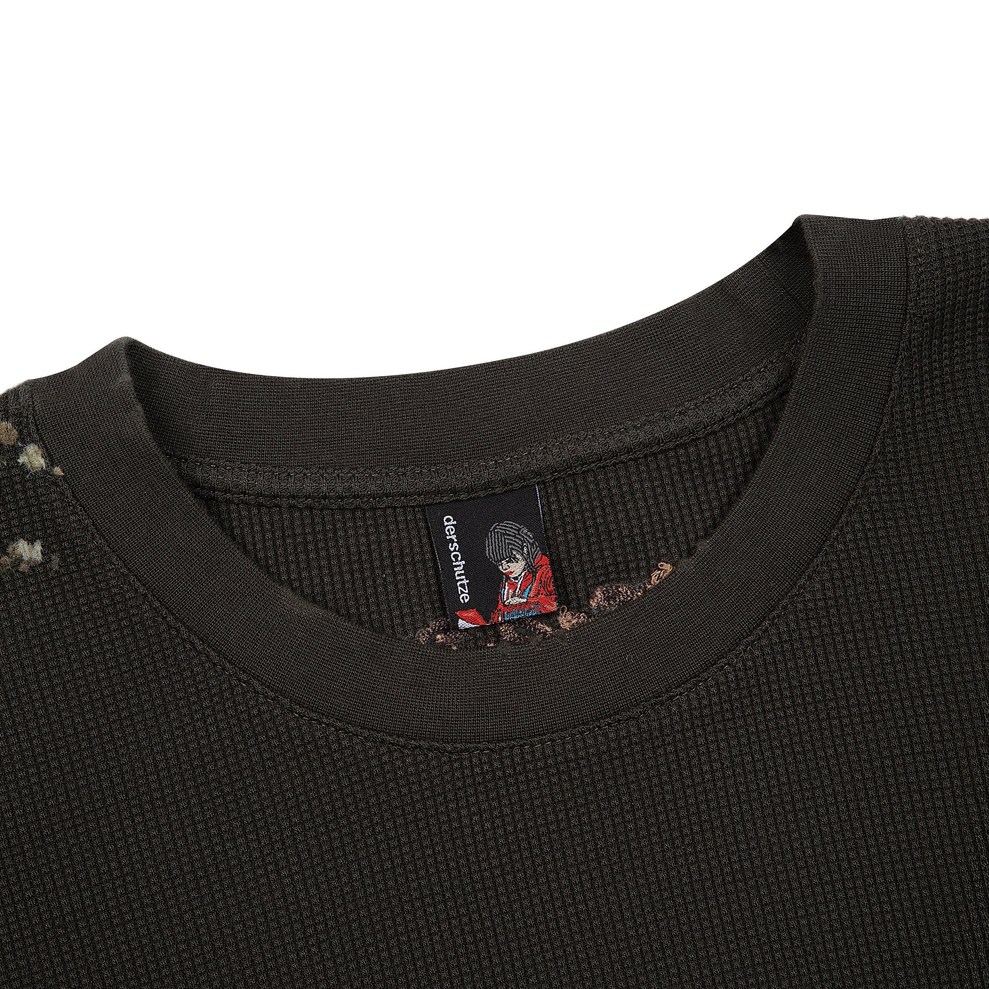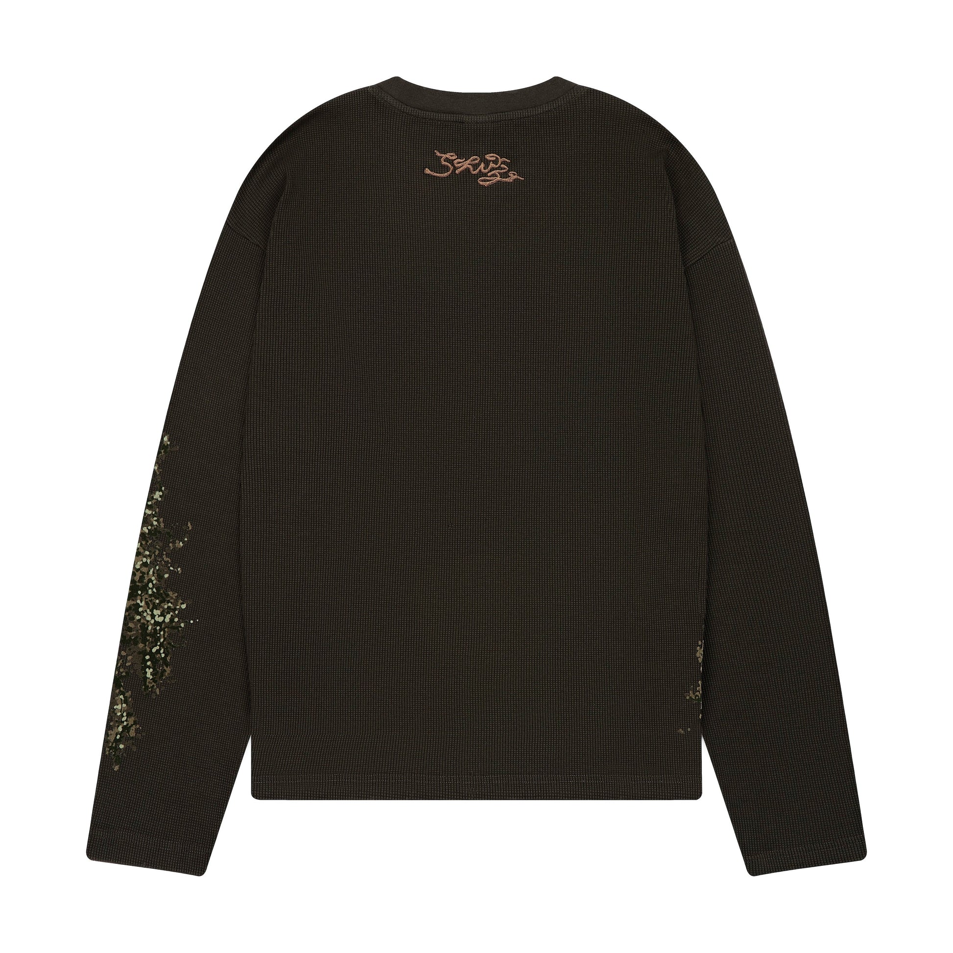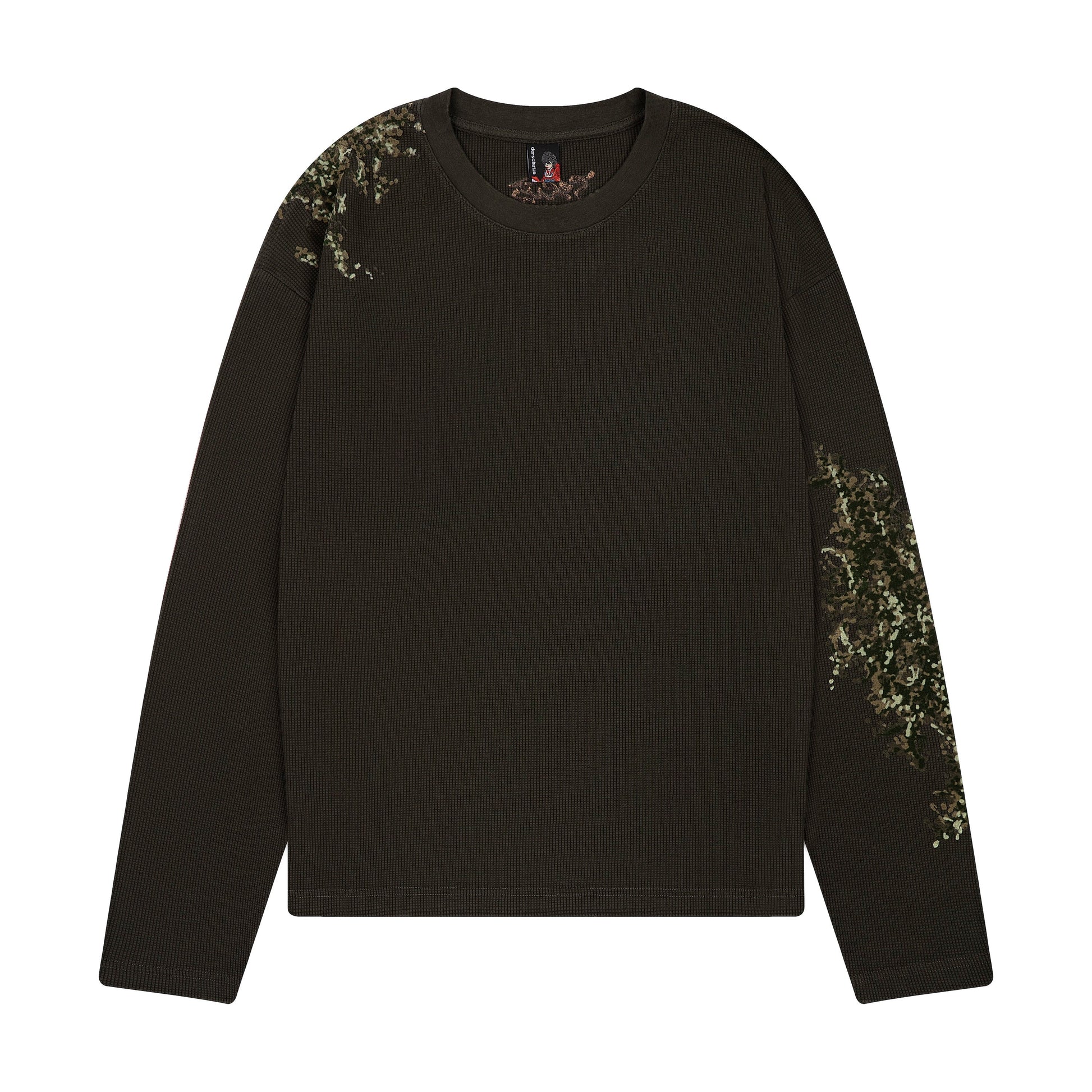 320gsm waffle fabric / 97% preshrunk cotton 3% elastane / embroidered on the neck / flock print on front, shoulder and sleeve / slightly distressed on collar rib, cuffs and hem / fits true to size