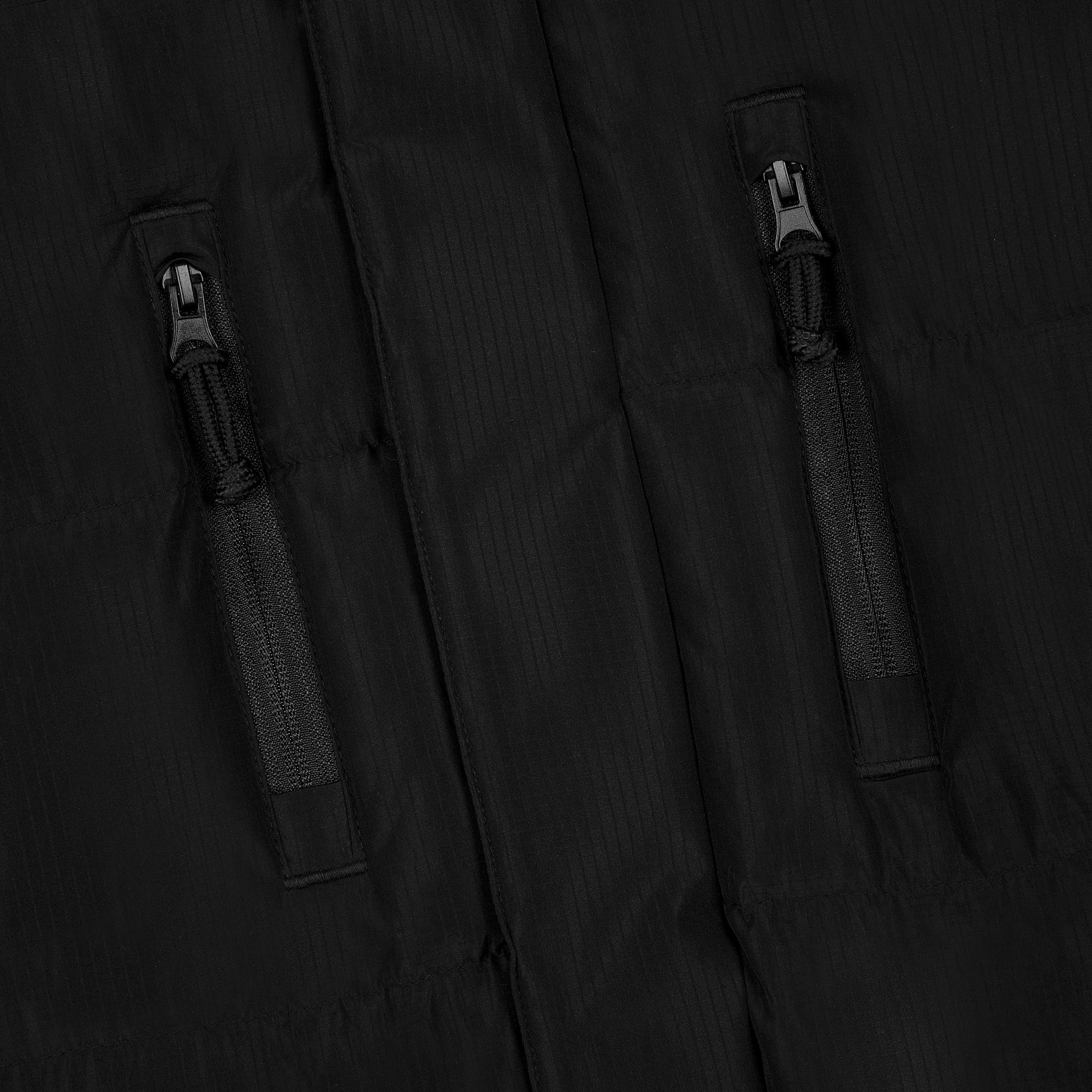 water repellent fabric / 100% polyester / micro gel filling / embroidery on sleeves, front and back / removable hood ?/ adjustable waistband / ?fits true to size