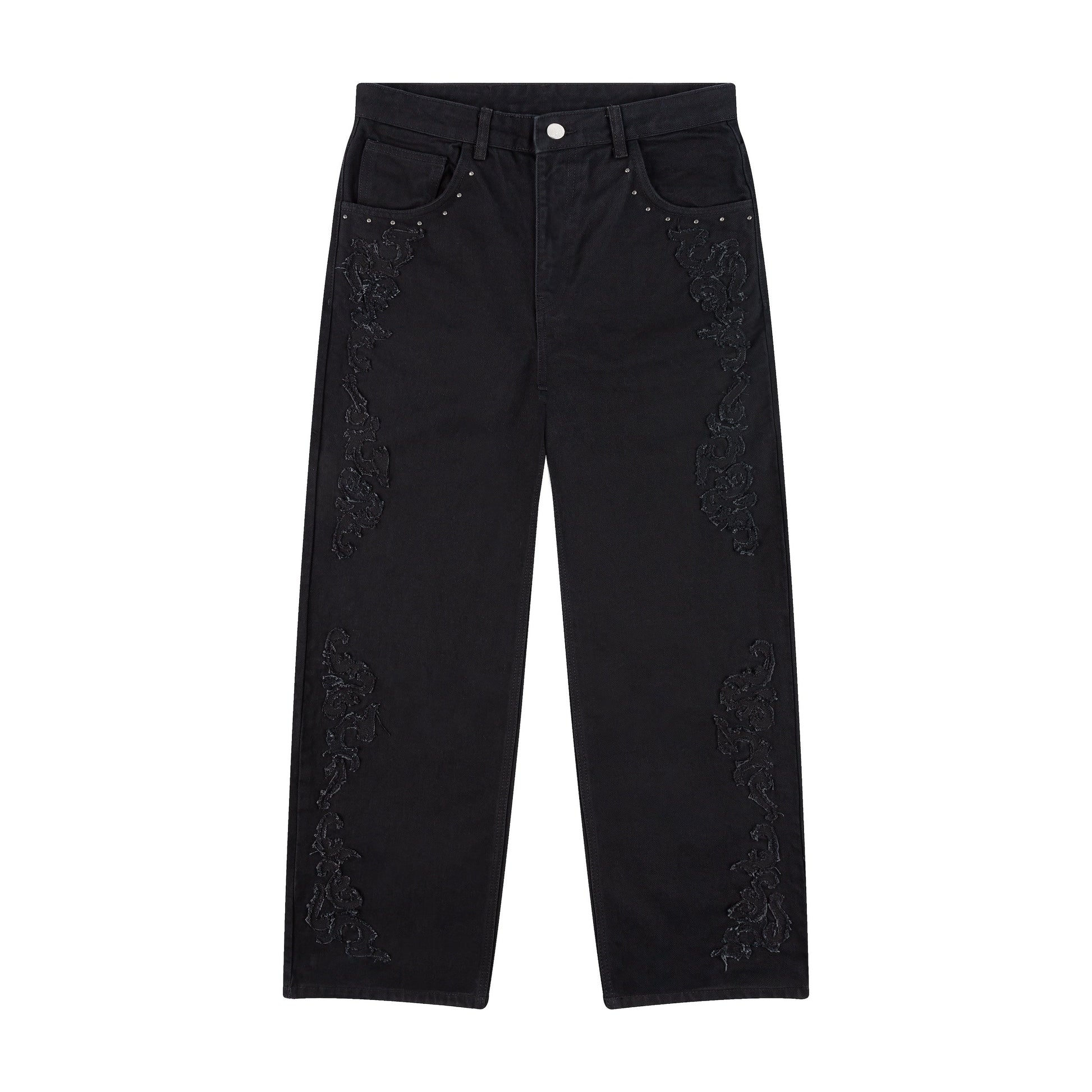 14,5oz denim / 100% cotton / embroidery on denim patches on front and back / embroidered leather patch / baggy fit