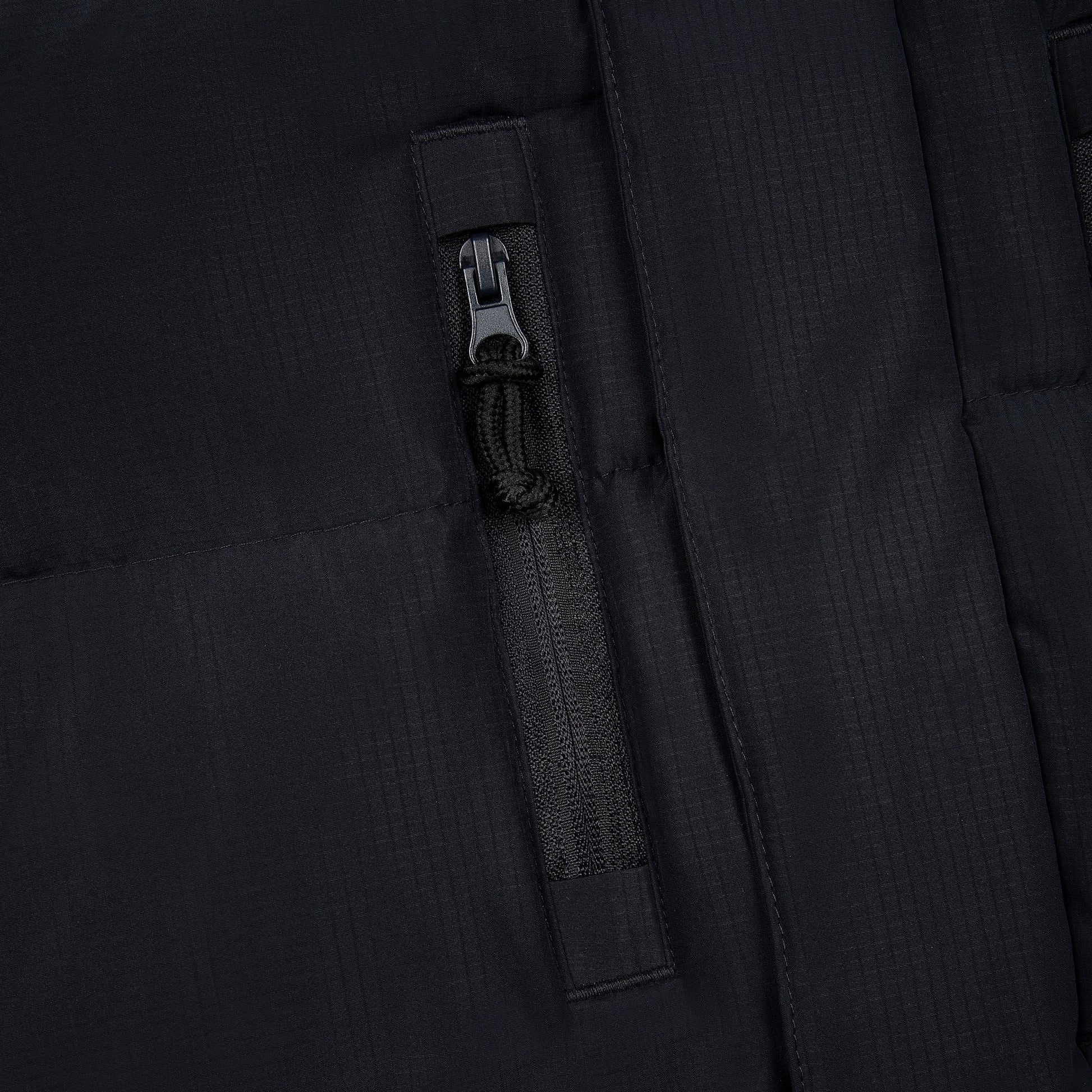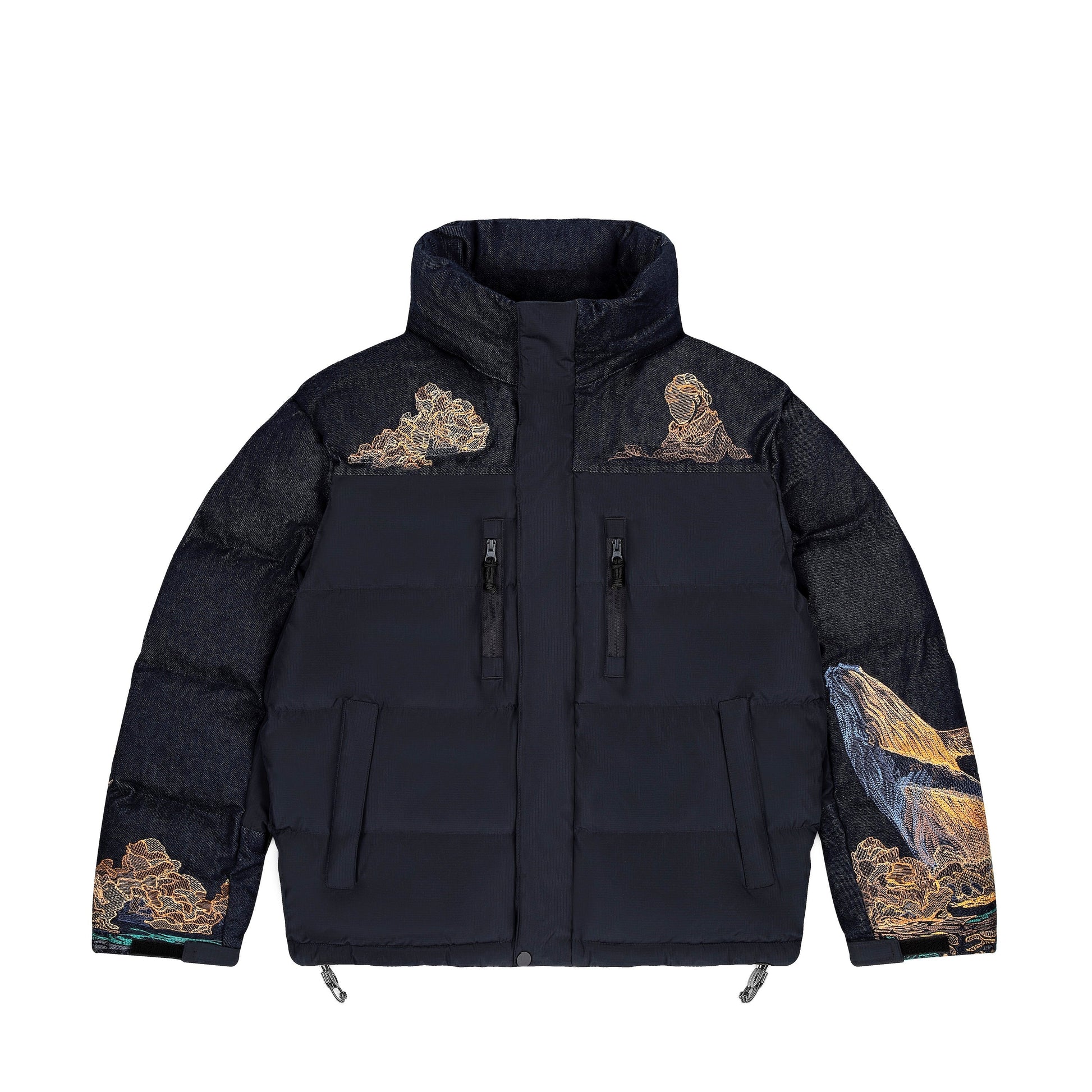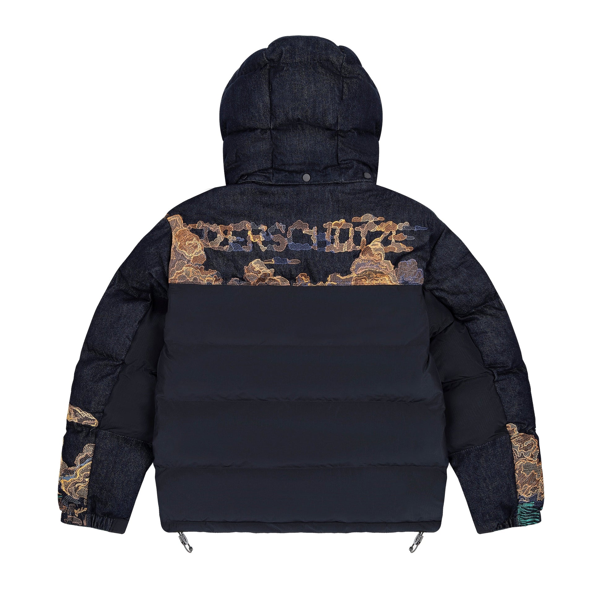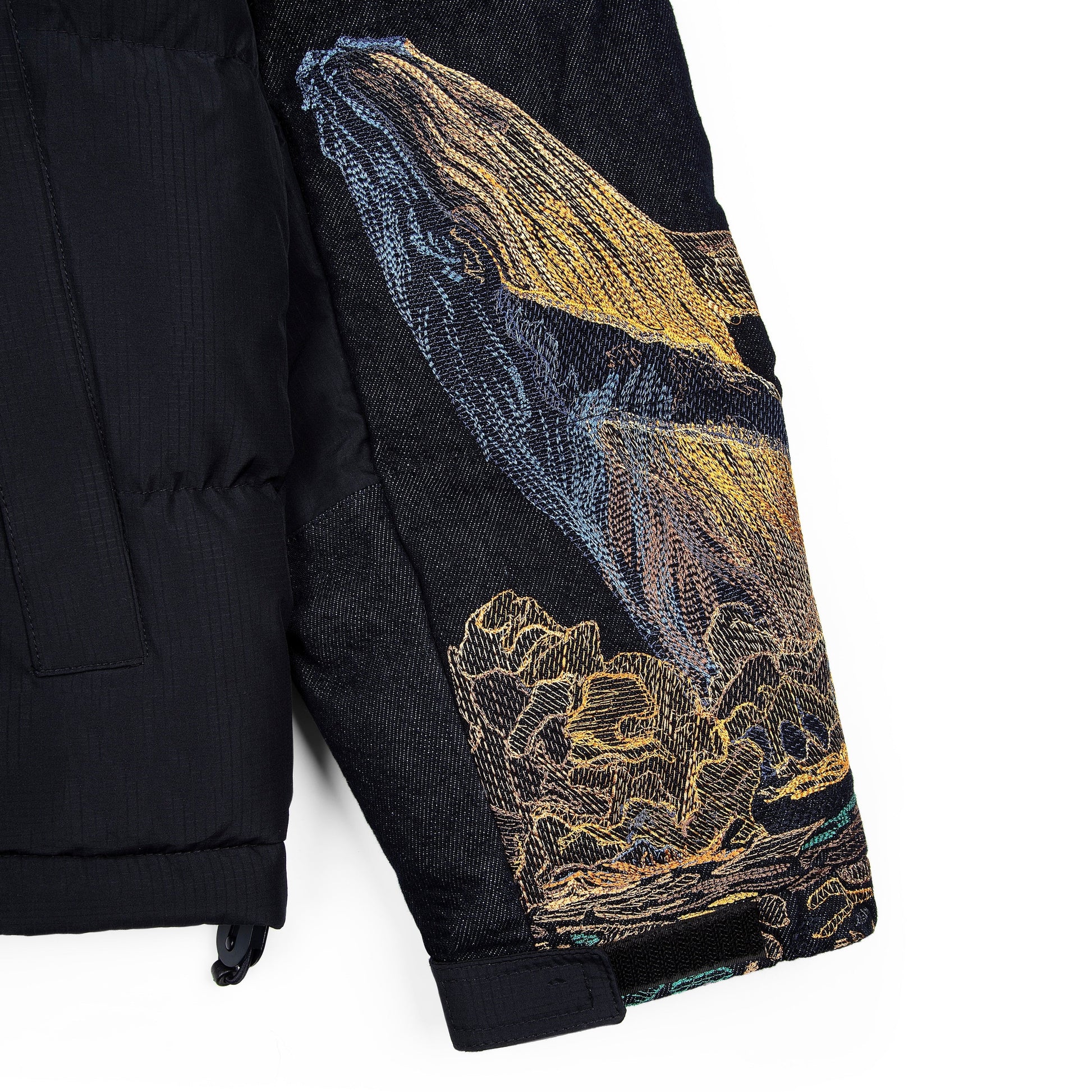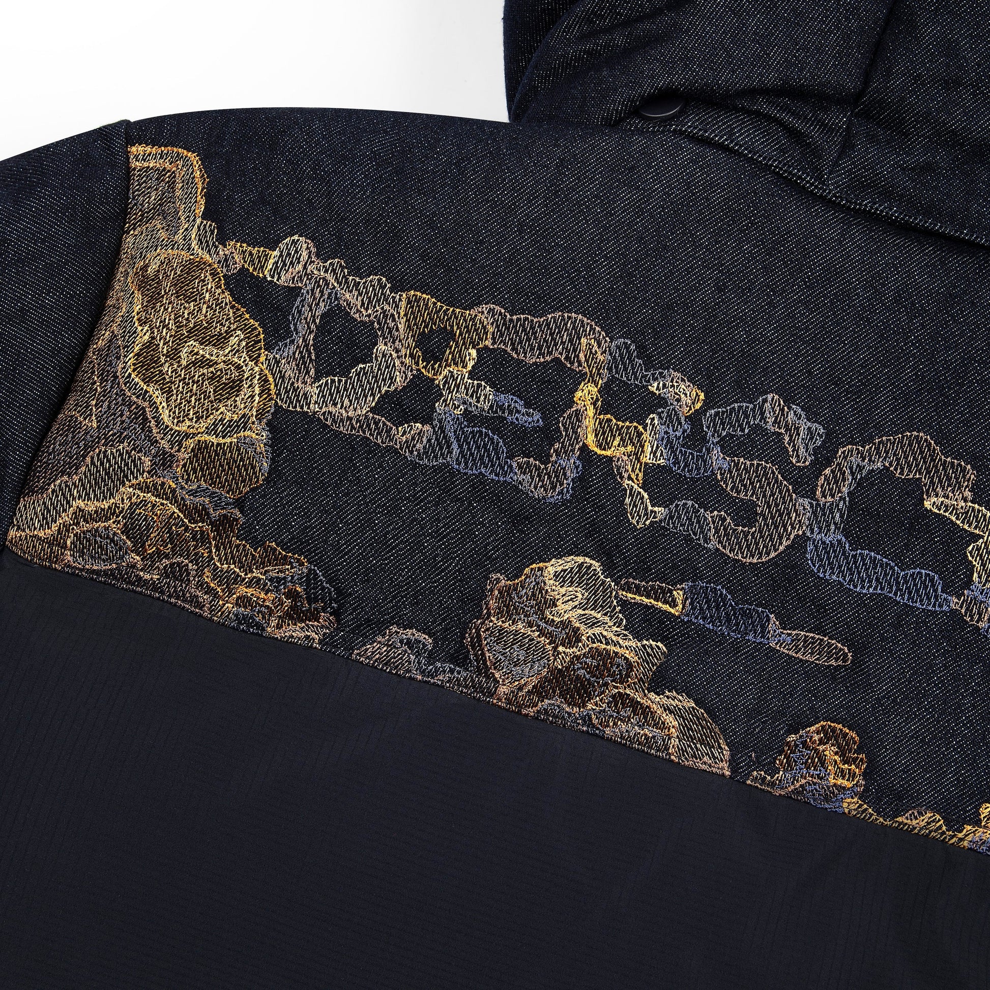 100% polyester water repellent fabric / 10oz denim / micro gel filling / embroidery on front-back yokes and sleeves / removable hood ?/ adjustable waistband / ?fits true to size