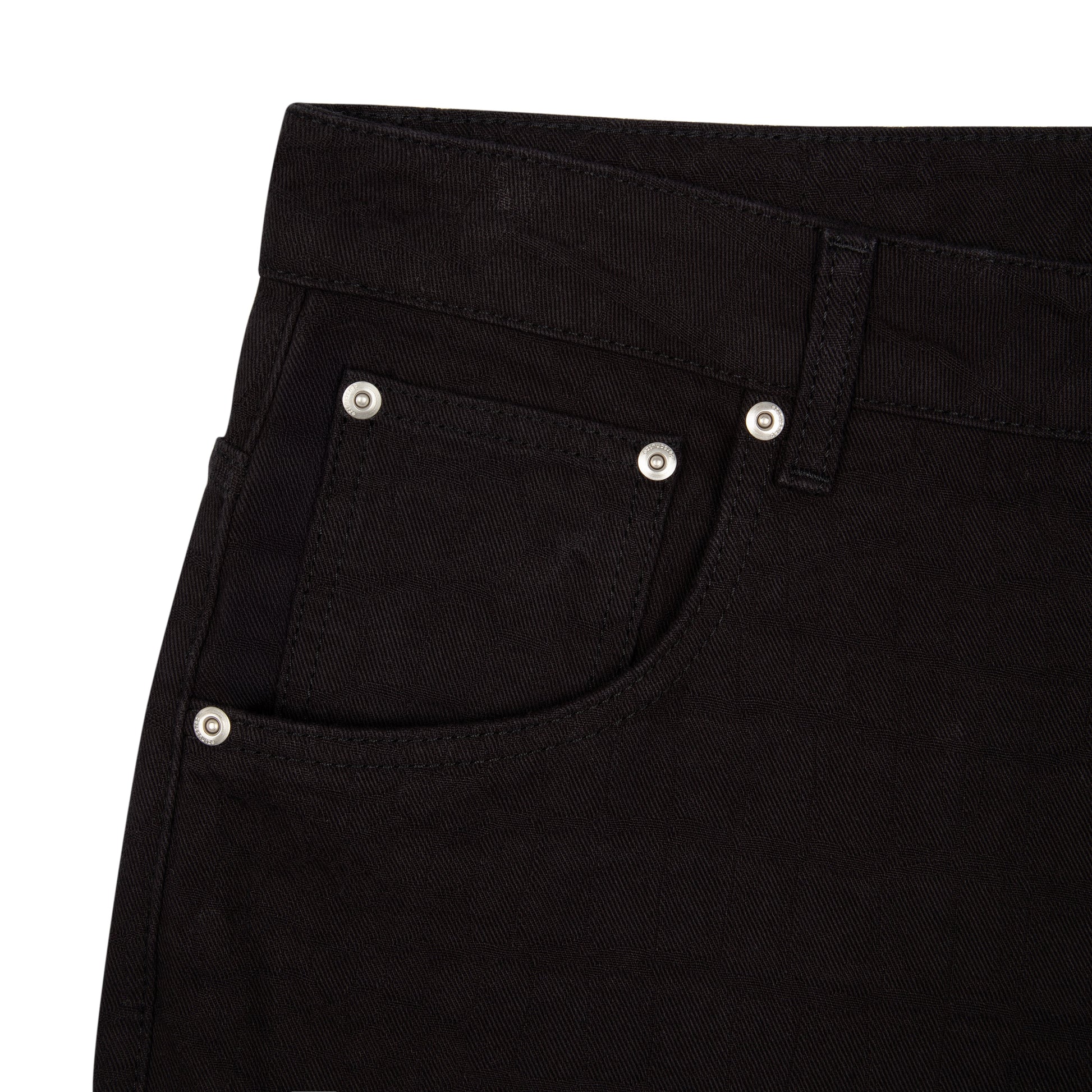 13oz jacquard patterned denim / 100% cotton / embroidery on front and back / debossed printed leather patch / wash inside out / straight fit / fits true to size