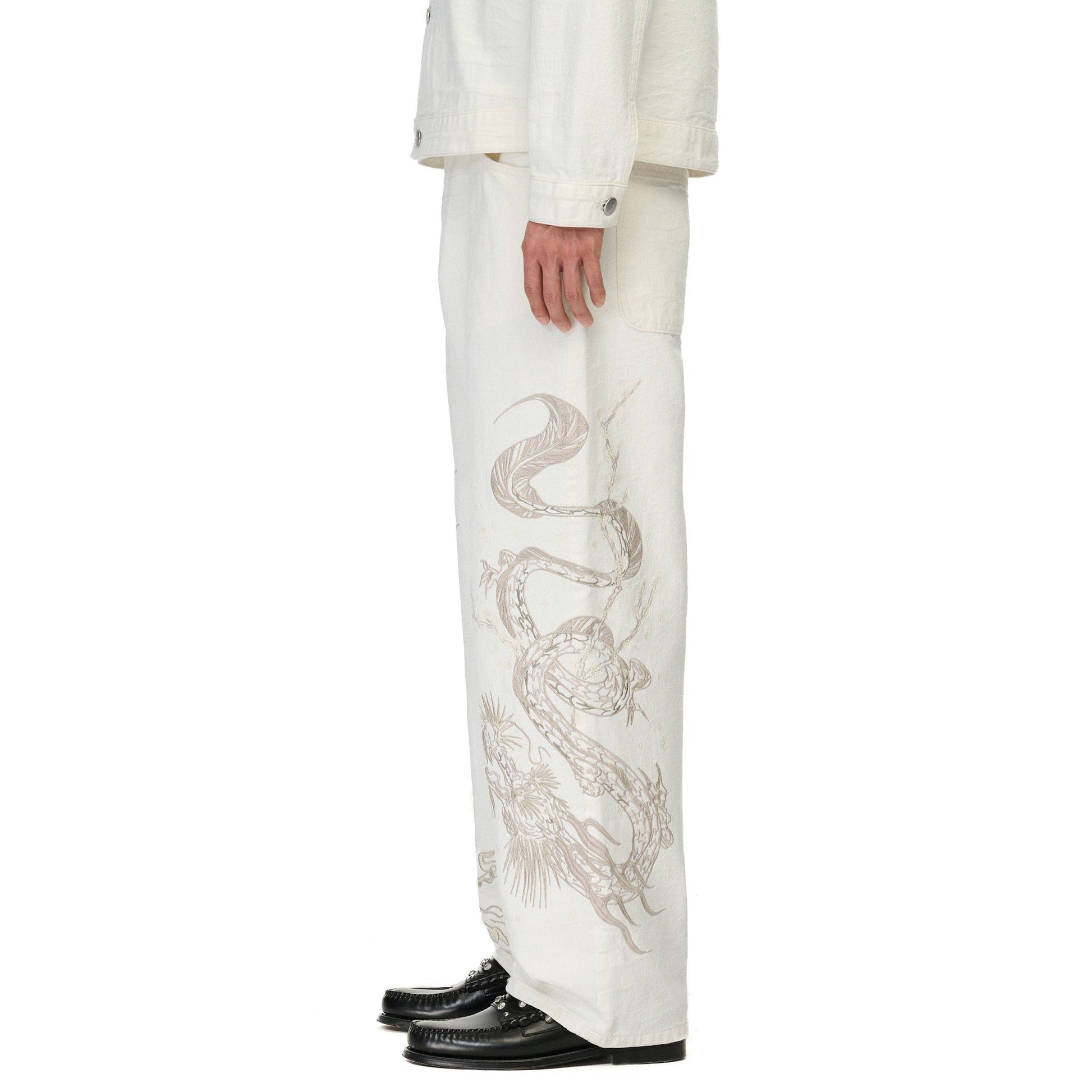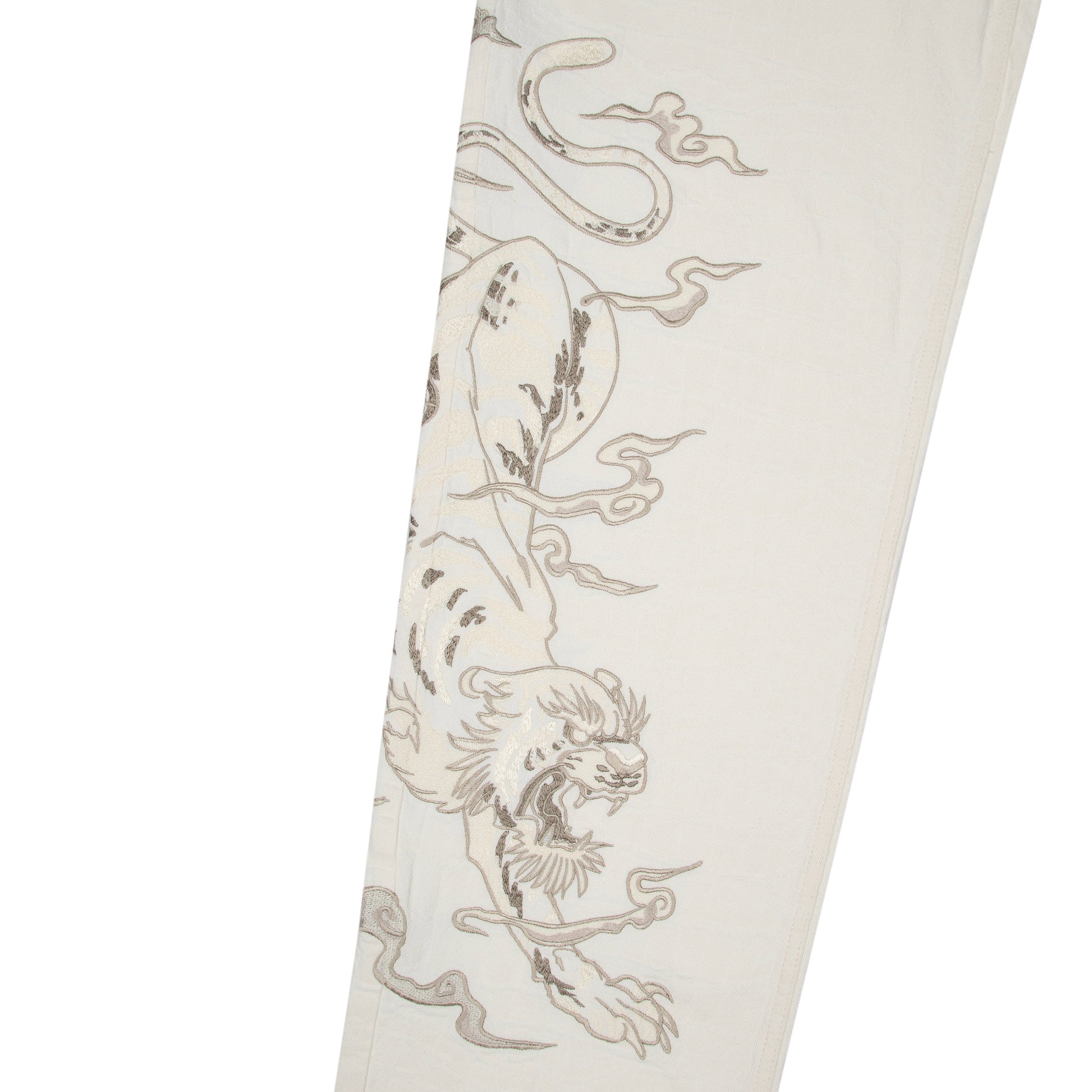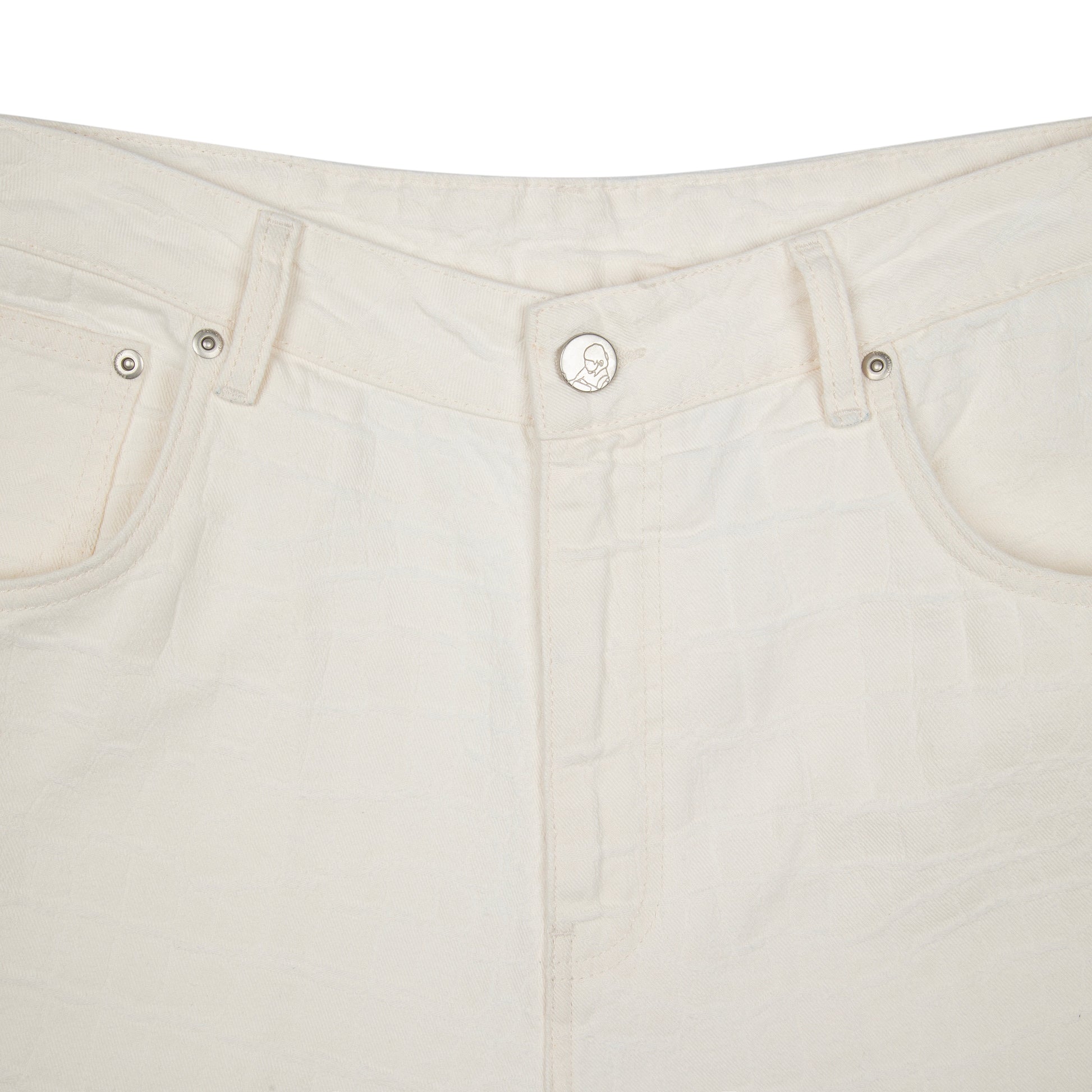 13oz jacquard patterned denim / 100% cotton / embroidery on front and back / debossed printed leather patch / wash inside out / straight fit / fits true to size