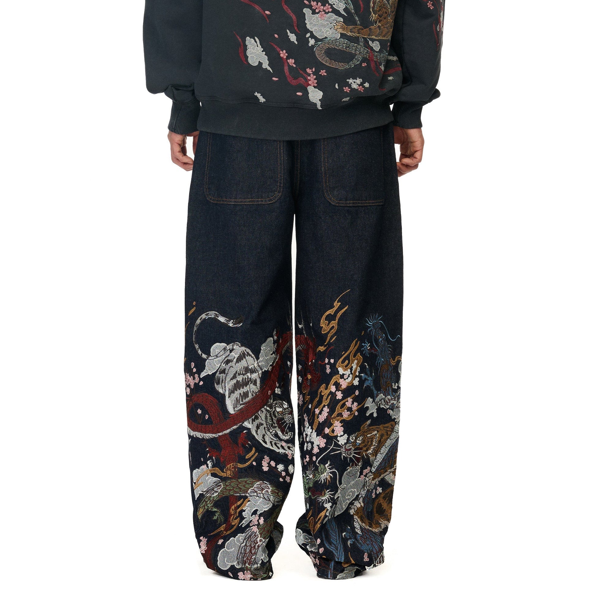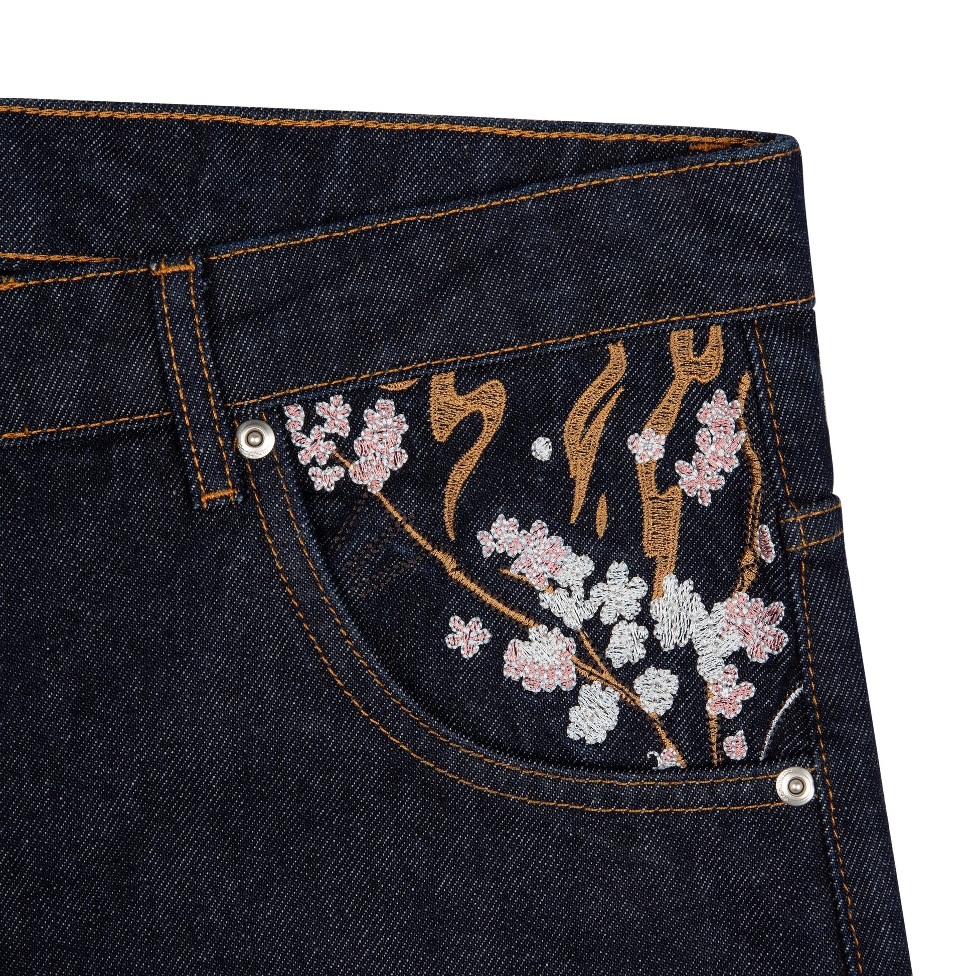 14oz raw denim / 100% cotton / embroidery on back / embroidered leather patch / wash inside out / balloon fit / fits true to size