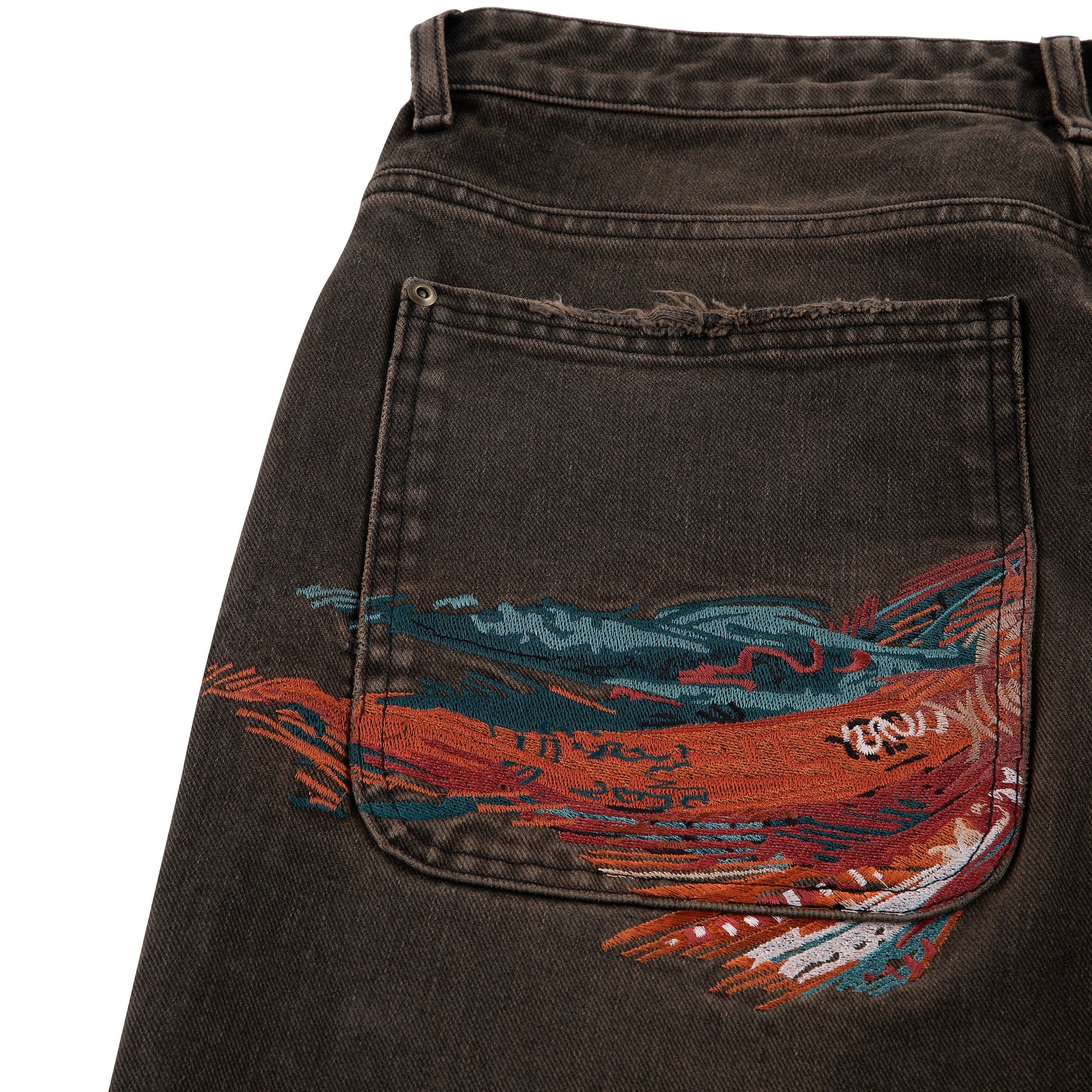 14,5 oz denim / 100% cotton/ 300 000+ stitches embroidery back details/ leather patch on back/ these are shorter compared to first batch/ ?baggy fit