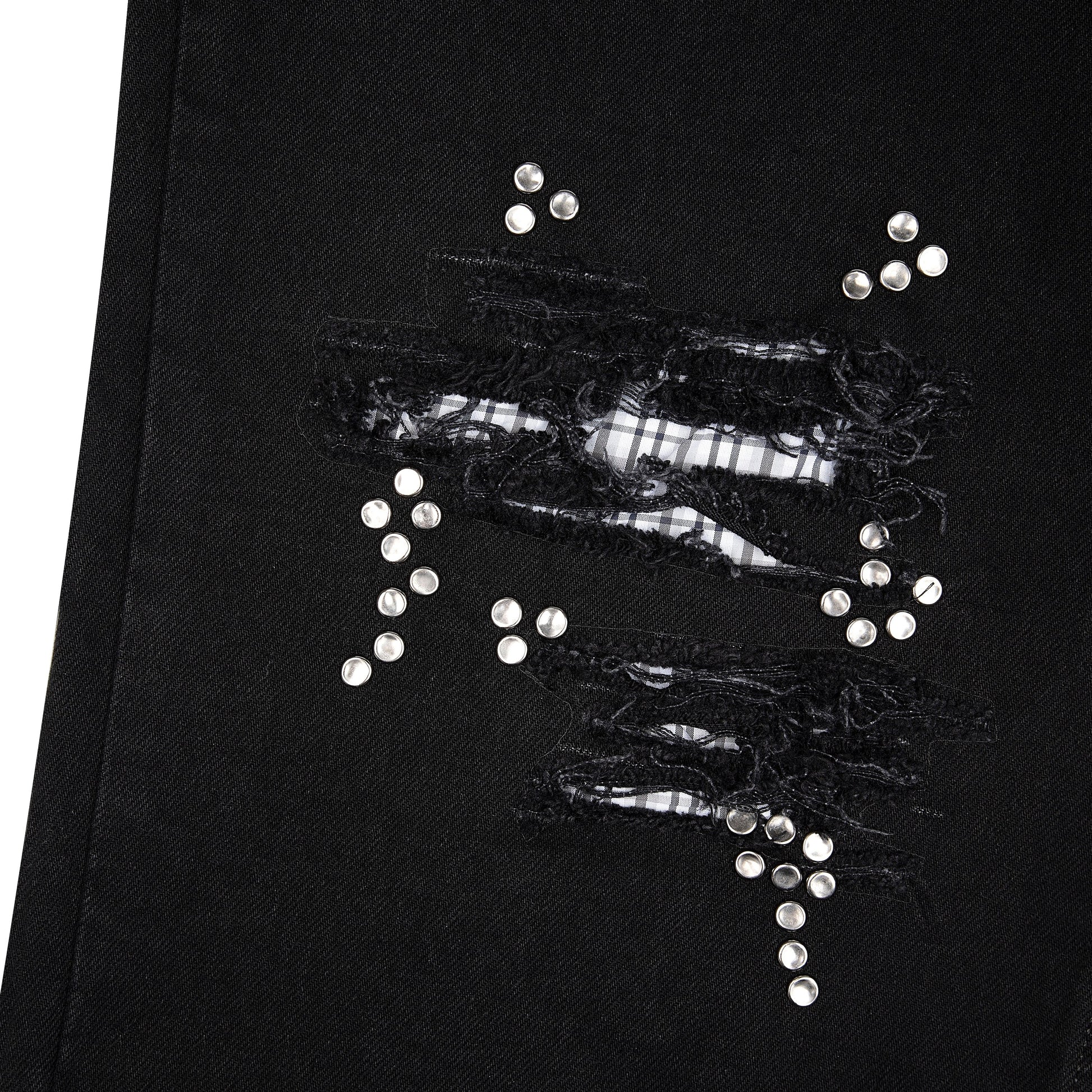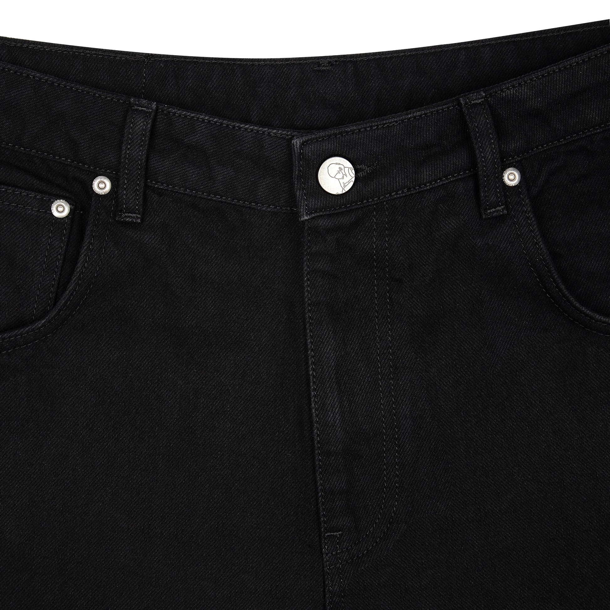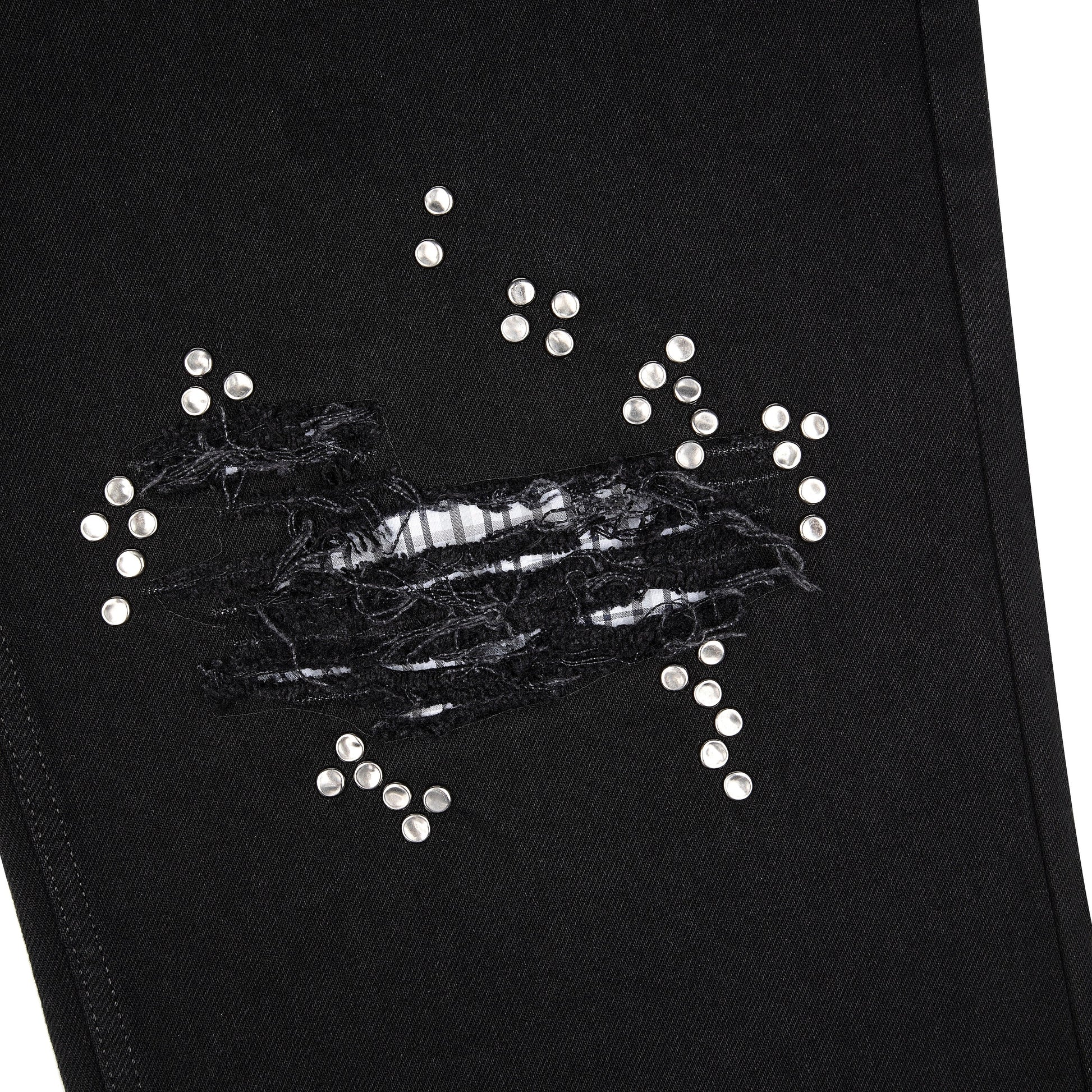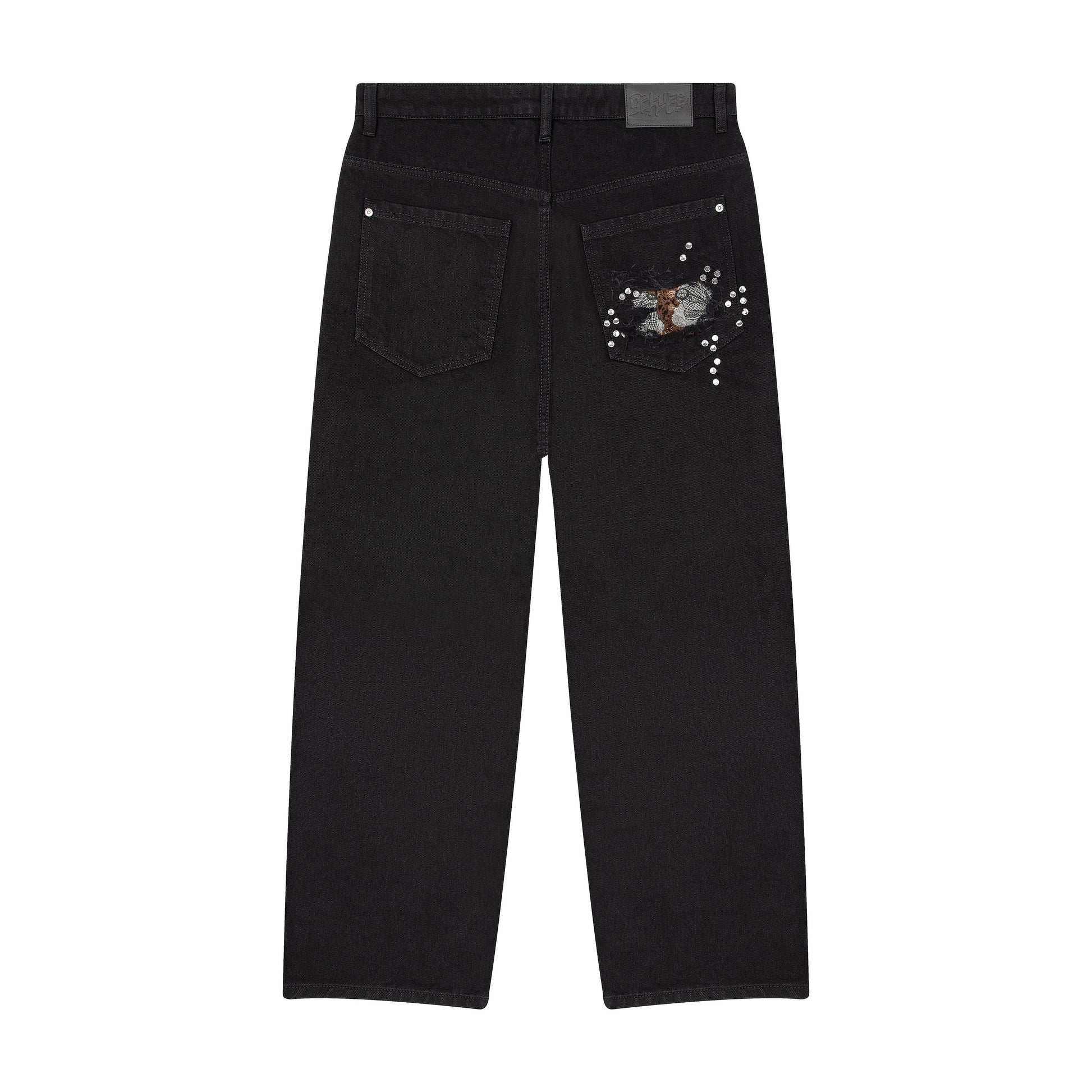 14,5oz denim / 100% cotton / distressed and patched at knees and back pocket / embroidery on back pocket patch / button studs at knees and back pocket / debossed printed leather patch / custom button / wash inside out / fits true to?size / all profits will be donated
